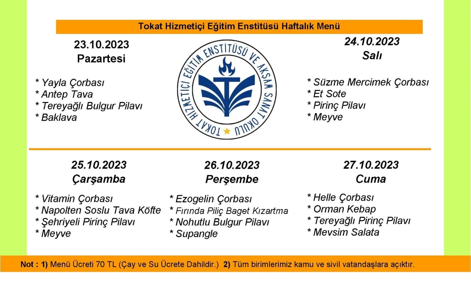 Kurumun paylaştığı menüde ücret 70 TL olarak belirtiliyor ve çay ve su ücrete dahil sayılıyor.
