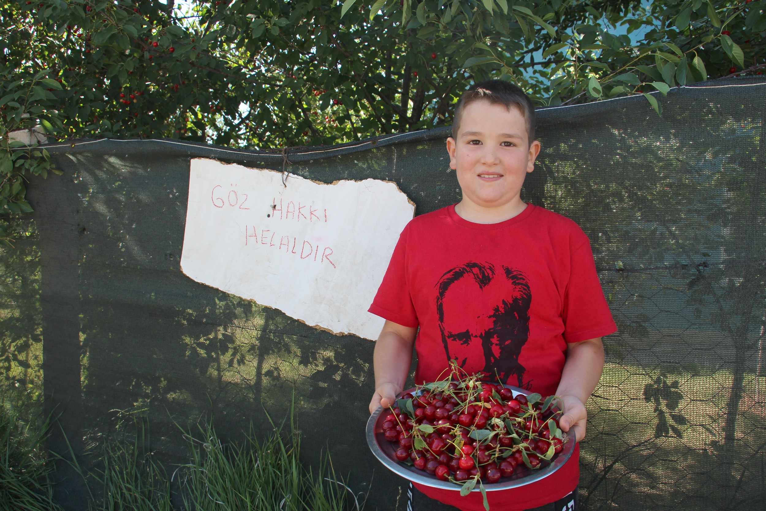 Kent merkezi Karşıyaka mahallesinde yaşayan Ahmet Hakan Koçak (9), yoldan geçen vatandaşların bahçelerinde bulunan vişneyi görünce canlarının çektiğini düşünerek kolları sıvadı. Ailesinin de desteğini alan Koçak, ağaçtan vişne koparıp yemek için tereddüt yaşayan vatandaşlar için ‘Göz hakkı helaldir' yazısı yazdı. Koçak, tahta parçasına yazdığı yazıyı evlerinin bahçesinde bulunan çite astı. Yazıyı görenin gönül rahatlığıyla vişne yemeğe geldiğini belirten Koçak, mutlu olduğunu ifade etti.