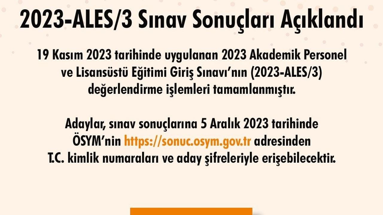 Ölçme, Seçme ve Yerleştirme Merkezi (ÖSYM) Başkanlığı, 19 Kasım 2023 tarihinde uygulanan 2023 Akademik Personel ve Lisansüstü Eğitimi Giriş Sınavı’nın (2023-ALES/3) sonuçlarının açıklandığını bildirdi.