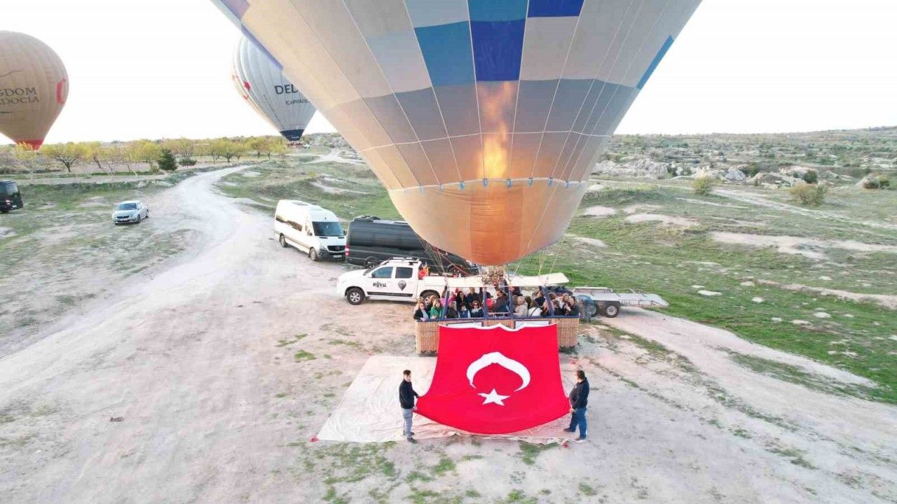 Kapadokya’da sabahın erken saatlerinde havalanan sıcak hava balonları 23 Nisan Ulusal Egemenlik ve Çocuk Bayramı için Türk Bayrakları ile havalandı. Gökyüzünde görsel şölen oluştu.