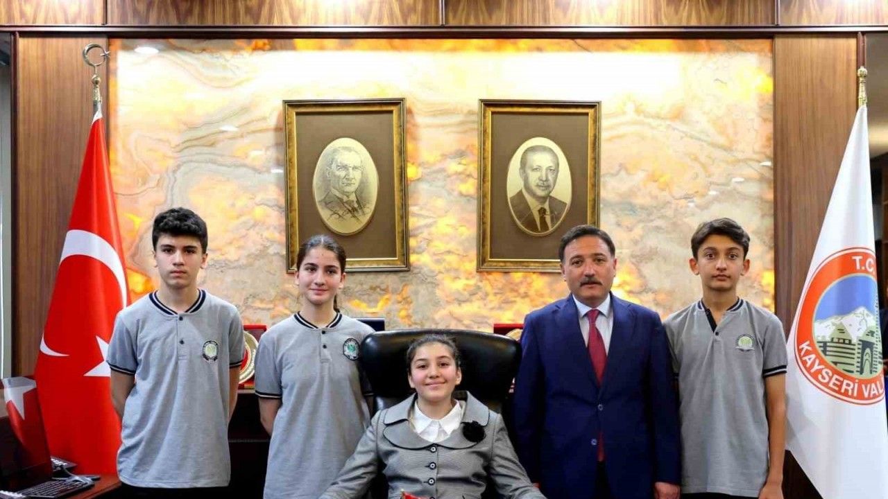 Kayseri Valisi Gökmen Çiçek, 23 Nisan Ulusal Egemenlik ve Çocuk Bayramı dolayısıyla temsili olarak koltuğunu Kocasinan İlçesi Osman Ulubaş Sümer Ortaokulu 7. sınıf öğrencisi Zeynep Erdoğan’a devretti.