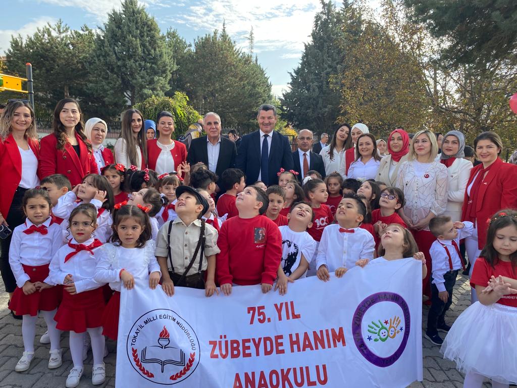 75. Yıl Zübeyde Hanım Anaokulu’nun düzenlediği etkinliğe Tokat İl Milli Eğitim Müdürü Ahmet Özdemir, torunu Zeynep Su da bu okulda öğrenci olan Anadolu Basın Birliği Tokat Şubesi Başkanı Sezai Kaymak da iştirak etti. Anaokulu öğrencileri, etkinlik kapsamında okulun konferans salonunda şiir dinletisi, gösteriler gerçekleştirdi.