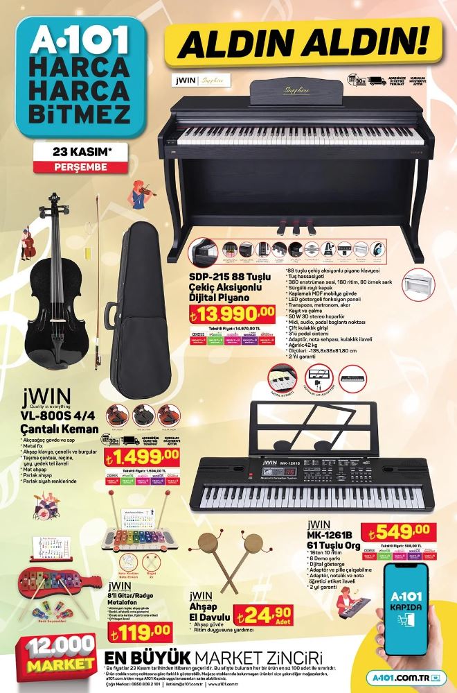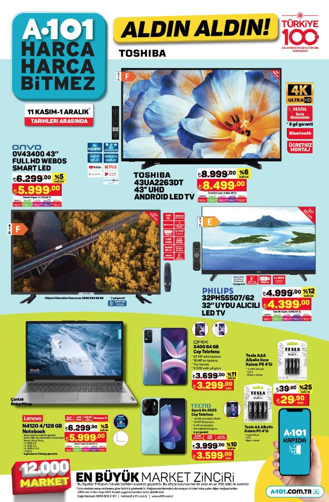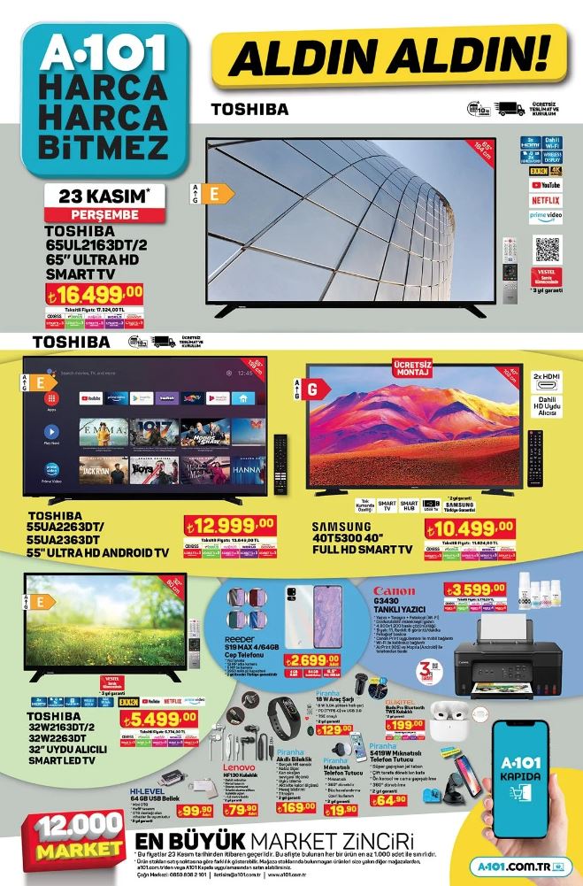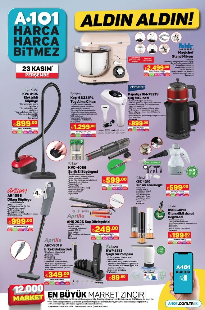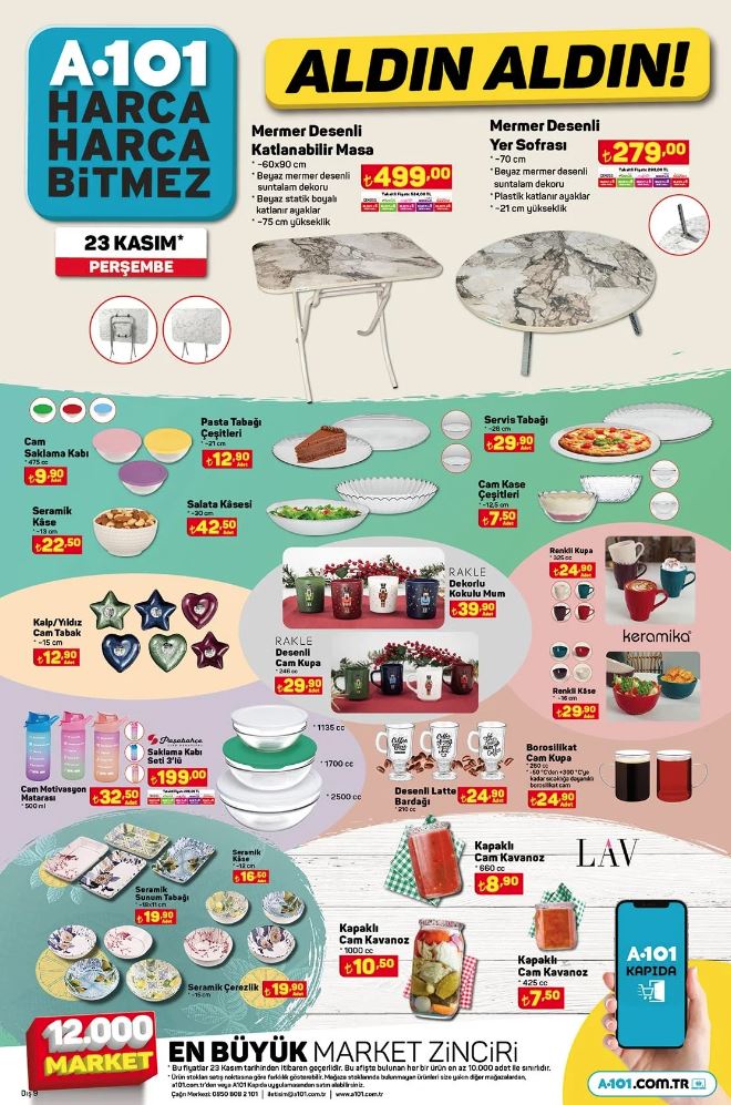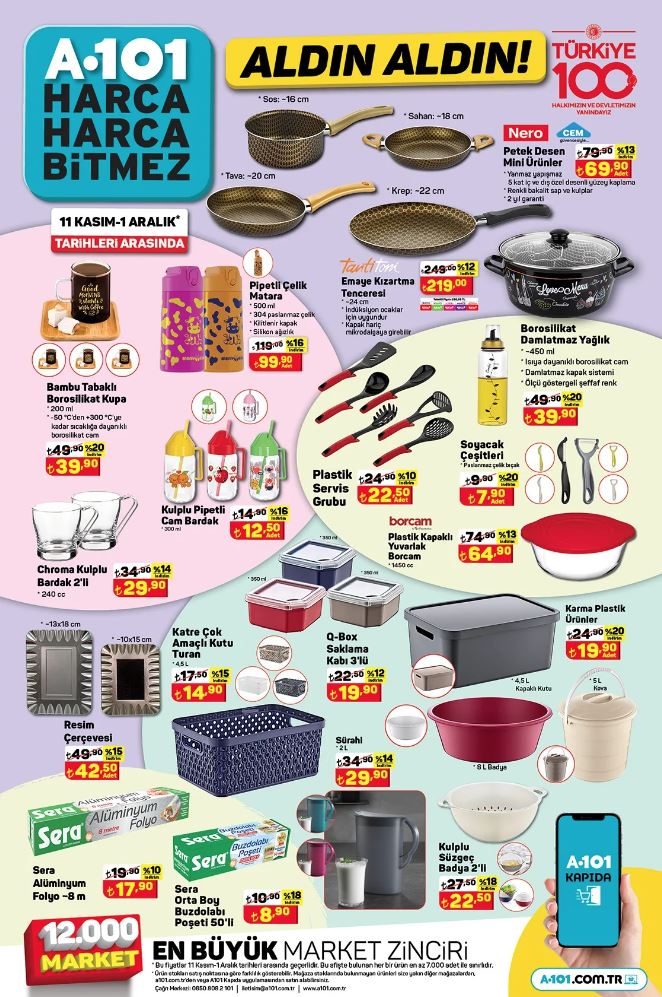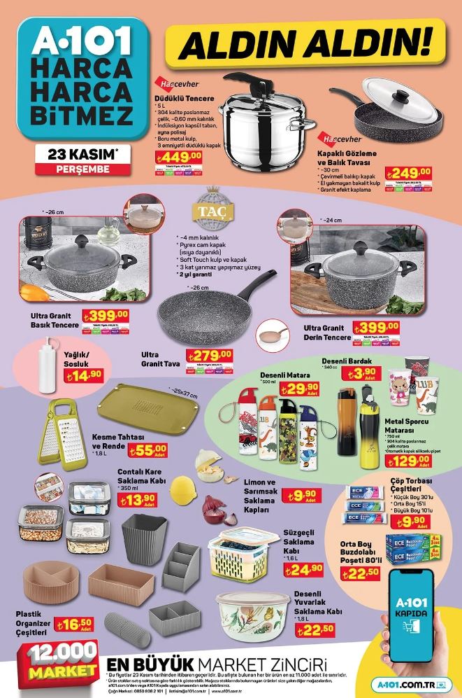 Türkiye'nin önde gelen perakende zincirlerinden biri olan A101, 23 Kasım ile 29 Kasım 2023 tarihleri arasında geçerli olacak aktüel ürünler kataloğunu yayınladı. Bu hafta tüketicilere cazip fiyatlarla sunulan birbirinden çeşitli ürünler arasında cep telefonları, elektronik eşyalar, ev eşyaları ve daha birçok kategori yer alıyor.