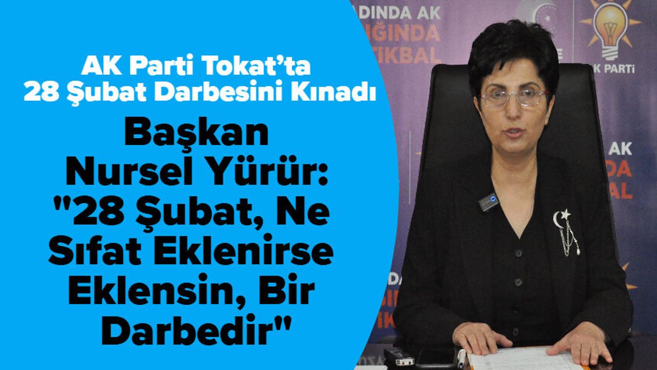AK Parti Tokat İl Başkan Yardımcısı ve İnsan Hakları Başkanı Nursel Yürür, 28 Şubat Darbesi'nin 28. yıl dönümünde basın açıklaması yaptı. Parti il binasının toplantı salonunda saat 10.00’da gerçekleşen açıklamaya AK Parti Tokat Milletvekili Mustafa Arslan’ın eşi ve eski Kadın ve Demokrasi Derneği (KADEM) Tokat Temsilcisi Müjgan Arslan, Genel Merkez Kadın Kolları MKYK Üyesi Havva Sabuncuoğlu, Kadın Kolları Başkanı Nurgül San, teşkilat üyeleri ve basın mensupları katıldı. Programda, 28 Şubat sürecinin toplumsal etkileri, mağduriyetleri ve Türkiye’nin demokrasi mücadelesi ele alındı. Nursel Yürür’ün yaptığı açıklamanın ardından toplantıya katılan isimler de sürece dair görüşlerini paylaştı.