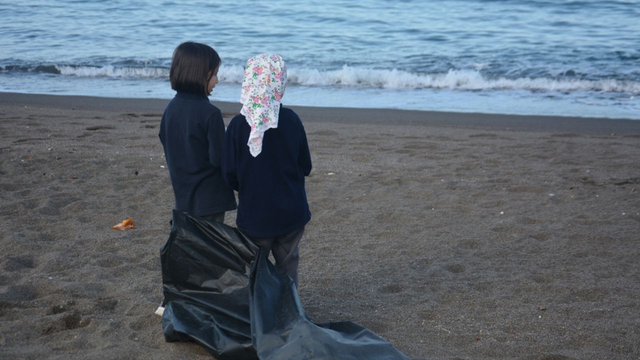 Öğrenciler, plajdan topladıkları plastik şişe, poşet ve çöpleri torbalara koyduktan sonra belediye ekiplerine teslim etti.