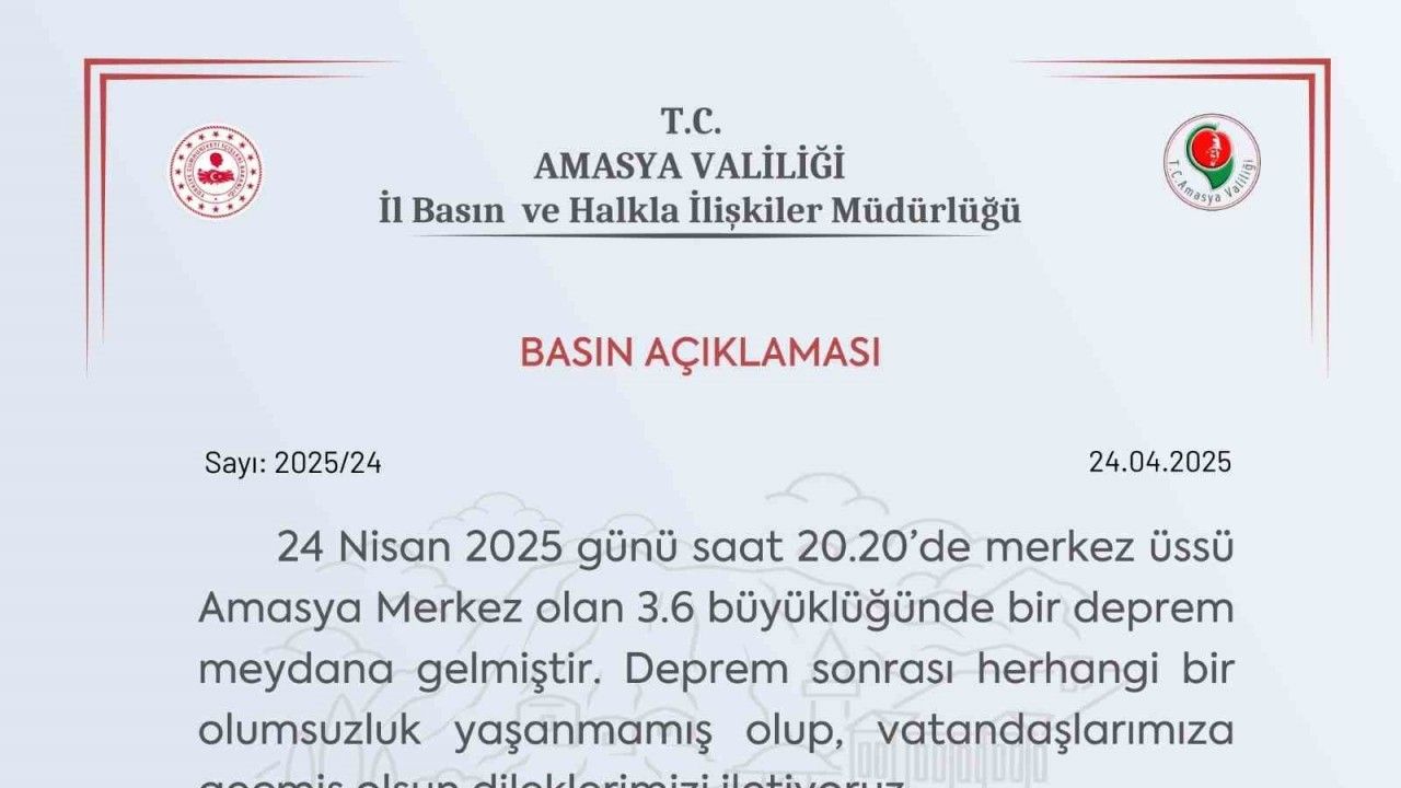 Depremle ilgili olarak Amasya Valilği’nden yapılan açıklamada, "Merkez üssü Amasya merkez olan 3.6 büyüklüğünde bir deprem meydana gelmiştir. Deprem sonrası herhangi bir olumsuzluk yaşanmamış olup, vatandaşlarımıza geçmiş olsun dileklerimizi iletiyoruz" ifadelerine yer verildi.