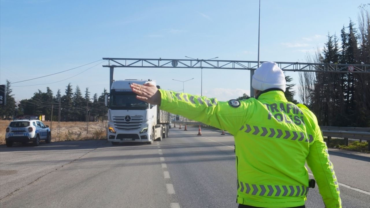 Durdurulan tır, kamyon, otobüs, minibüs gibi ticari araçlara kış lastiği takılıp takılmadığı ve takılan lastiğin diş kalınlıklarının belirlenen ölçülere uygun olup olmadığı dijital kumpas cihazıyla kontrol edildi.