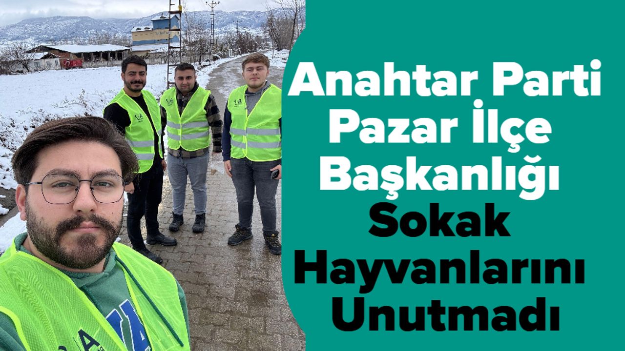 Anahtar Partisi Pazar İlçe Başkanlığı, soğuk kış günlerinde yiyecek bulmakta zorlanan sokak hayvanları için anlamlı bir etkinlik düzenledi. İlçe Başkanı Av. Serdar Han, yaptığı açıklamada, sokak hayvanlarının aç kalmaması için çeşitli noktalara yiyecek bıraktıklarını belirterek, "Bu kış günlerinde sokak hayvanlarının aç kalmaması için yiyecek bıraktık. Bu canlıları Allah'ın bize bir emaneti olarak görüyor ve elimizden geldiğince sahip çıkmaya çalışıyoruz." dedi.