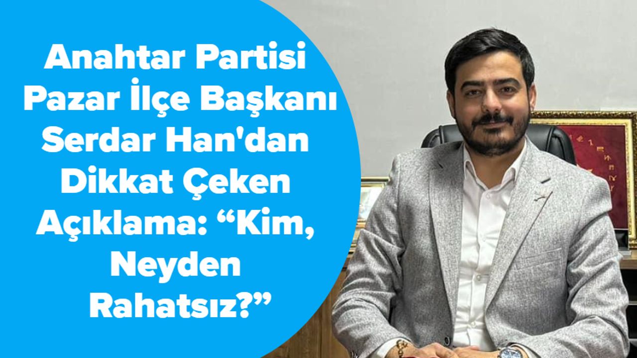 Anahtar Partisi Pazar İlçe Başkanı Av. Serdar Han, sosyal medya üzerinden yaptığı açıklamada, partinin ilçe teşkilatının kurulalı yaklaşık 4 ay olduğunu ve bu süreçte güçlü bir teşkilat oluşturulduğunu belirtti. Han, “Memleket” diyerek yola çıktıklarını, kimseyi ayrıştırmadan, herkese saygı göstererek mütevazı bir şekilde çalıştıklarını ifade etti. Halktan olumlu geri dönüşler aldıklarını ve şahsi menfaatlerden uzak durarak memleket için mücadele ettiklerini vurguladı.