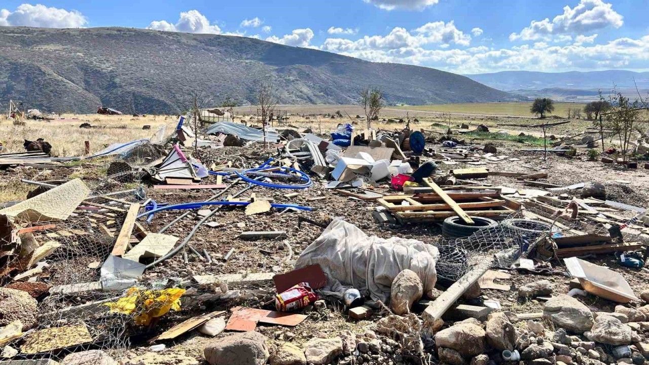 Ankara’nın Ayaş ilçesinde dün evlerin çatılarını havaya uçuran ve hobi bahçesindeki konteyner evin devrilmesi ile 1 kişinin hayatını kaybettiği fırtınanın ardından hasar tespit çalışmaları sürüyor. Fırtınanın hasara yol açtığı bölge görüntülendi.