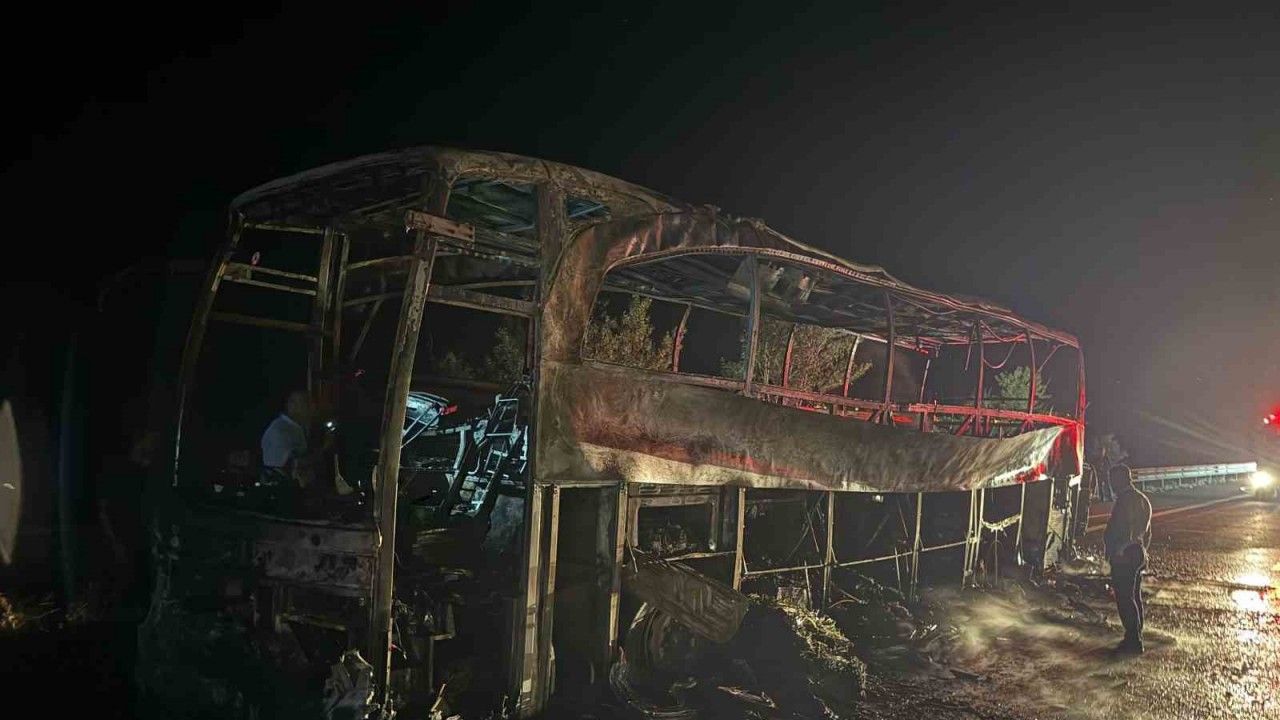 Ankara’nın Kızılcahamam ilçesinde seyir halindeyken yanmaya başlayan yolcu otobüsü kullanılamaz hale geldi.