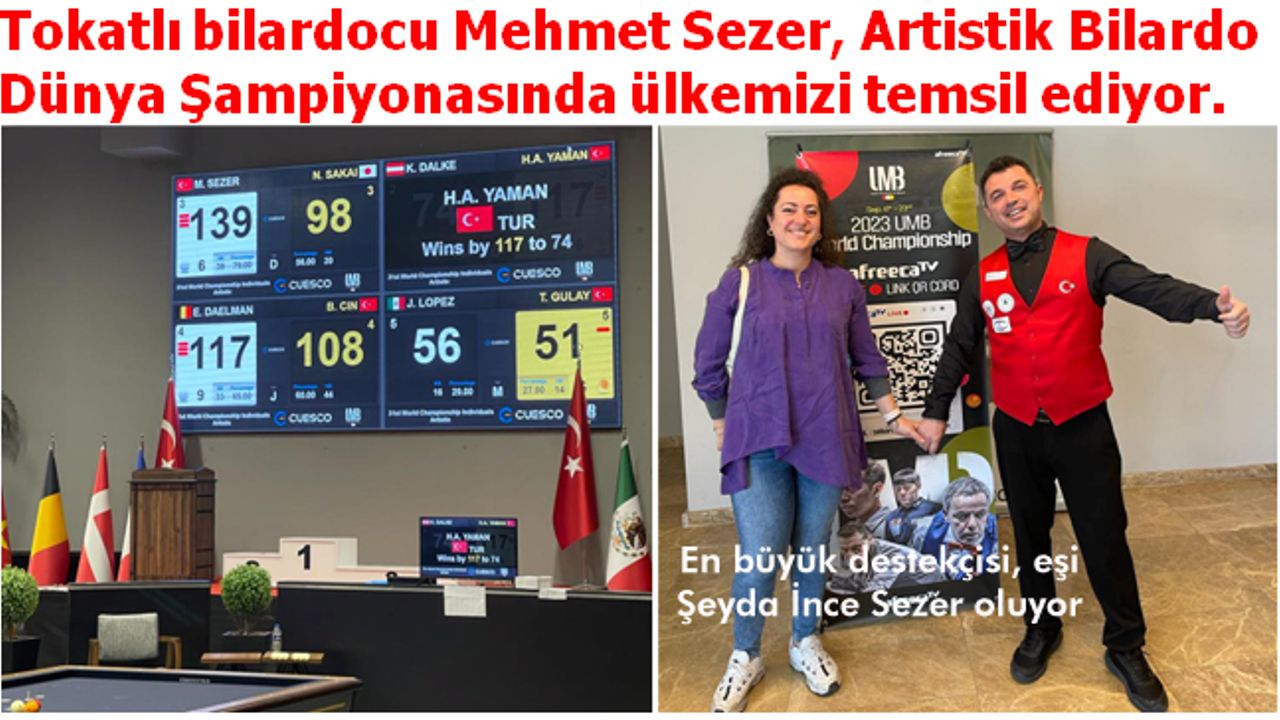 Tokatlı bilardocu Mehmet Sezer, 21 Eylül Perşembe günü Ankara Gölbaşı’nda bulunan Türkiye Bilardo Federasyonu tesislerinde düzenlenecek Artistik Bilardo Dünya Şampiyonasında ülkemizi temsil ediyor. İlk gün 3 müsabakasından 2’sini kazanıp 1’inde yenilen Mehmet Sezer son 16’ya kaldı. Çeyrek finale kalma mücadelesinde 23 Eylül Cumartesi günü saat 13.30’da tek müsabaka eleme usulüyle rakibinin karşısında olacak.