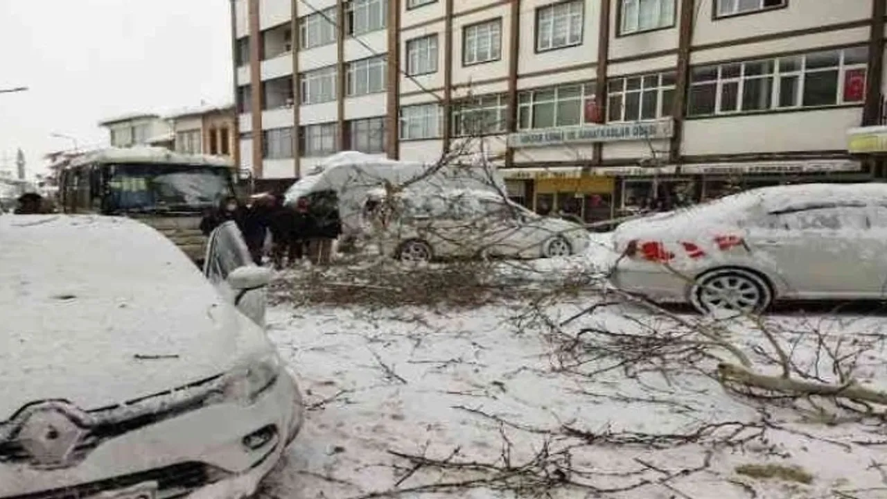 Tokat'ın Niksar ilçesinde asırlık çam ağacının dalları kar yağışına dayanamayarak iki aracın üzerine düştü.