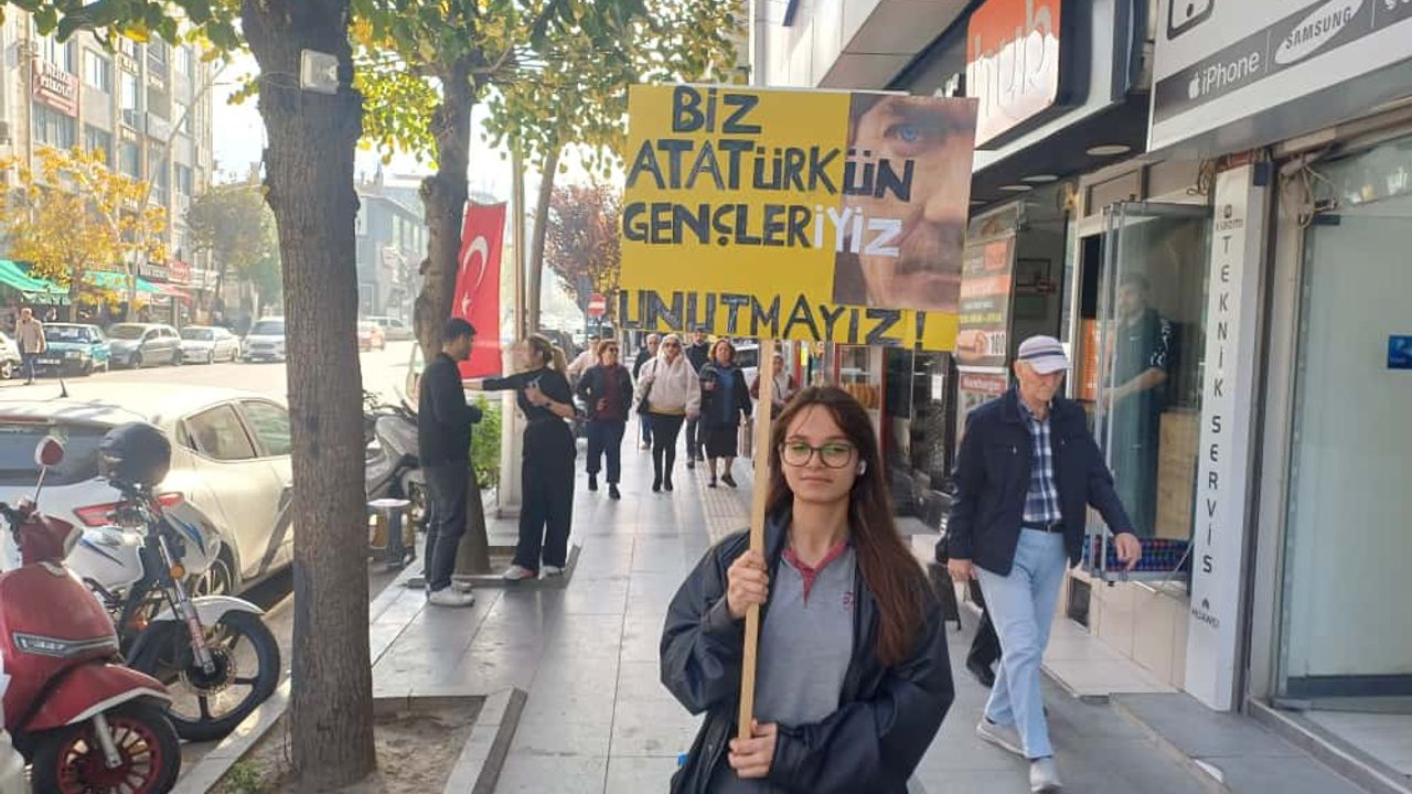 10 Kasım Atatürk'ü Anma Günü'nde Tokat'ta anlamlı ve sade bir eyleme imza atan Yeşilırmak Ticaret Mesleki ve Teknik Anadolu Lisesi son sınıf öğrencisi Irmak Gül, Sanayi Sitesi'nden üçgen kahvehaneye kadar elinde "Biz Atatürk'ün Gençleriyiz, Unutma" yazılı pankartla yürüdü.