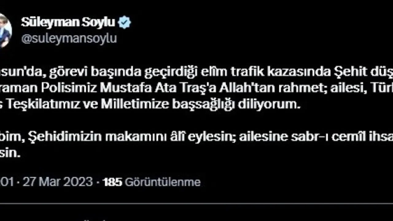İçişleri Bakanı Süleyman Soylu, Samsun'da görevi başında geçirdiği trafik kazası sonrası şehit düşen polis memuru Mustafa Ata Traş'la ilgili başsağlığı mesajı paylaştı.