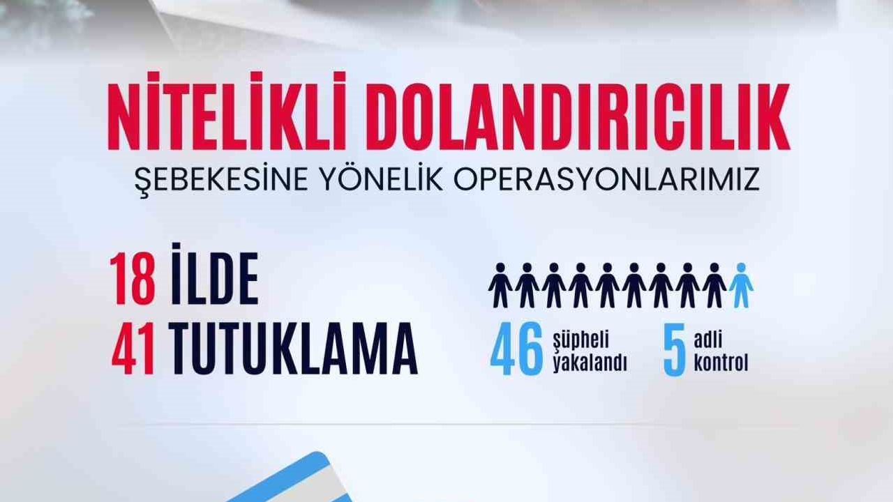 İçişleri Bakanı Yerlikaya sosyal medya hesabından yaptığı paylaşımda, Tekirdağ merkezli 18 ilde ‘Nitelikli Dolandırıcılık Şebekesine’ yönelik düzenlenen operasyonlarda; 46 şüphelinin yakaladığını 41’inin ise tutuklandığını belirterek, şu ifadelere yer verdi: