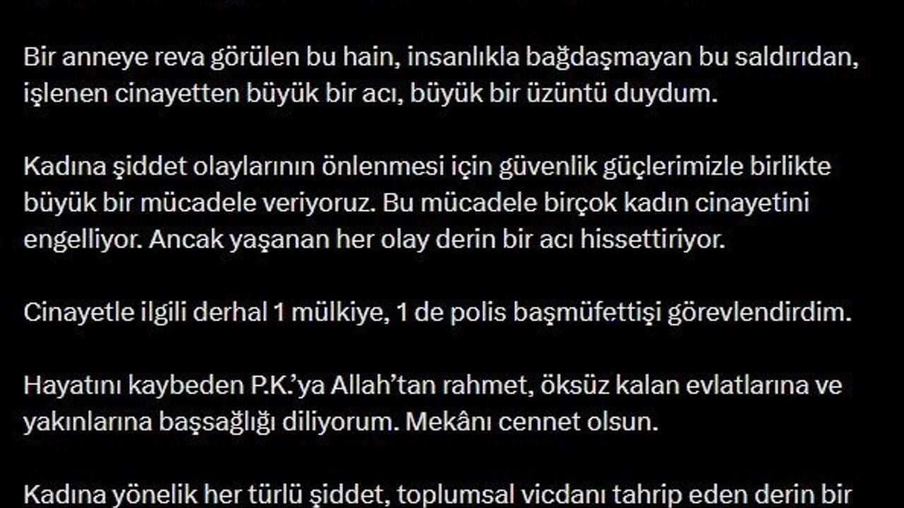 İçişleri Bakanı Yerlikaya, sosyal medya hesabından Manisa'da 7 çocuk annesi P.K.'nın 17 yıl evli kaldığı ve boşanma aşamasında olduğu H.K. tarafından öldürülmesine ilişkin yaptığı açıklamada, 'Bir anneye reva görülen bu hain, insanlıkla bağdaşmayan bu saldırıdan, işlenen cinayetten büyük bir acı, büyük bir üzüntü duydum. Kadına şiddet olaylarının önlenmesi için güvenlik güçlerimizle birlikte büyük bir mücadele veriyoruz. Bu mücadele birçok kadın cinayetini engelliyor. Ancak yaşanan her olay derin bir acı hissettiriyor. Cinayetle ilgili derhal 1 mülkiye, 1 de polis başmüfettişi görevlendirdim. Hayatını kaybeden P.K.'ya Allah'tan rahmet, öksüz kalan evlatlarına ve yakınlarına başsağlığı diliyorum. Mekânı cennet olsun. Kadına yönelik her türlü şiddet, toplumsal vicdanı tahrip eden derin bir yaradır. Kadına yönelik şiddeti sadece bir bireye değil; insanlık onuruna, insan haklarına, vicdana ve medeniyetimizin değerlerine vurulmuş bir darbe olarak görüyoruz. Bu mücadeleyi de kararlılıkla sürdürmeye devam edeceğiz' dedi.