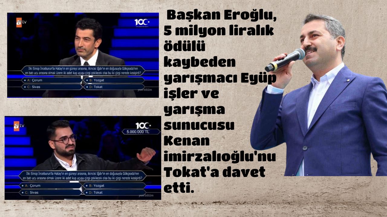 Tokat Belediye Başkanı Eyüp Eroğlu, bilgi yarışmasında "Tokat" cevabını vererek 5 milyon liralık ödülü kaybeden yarışmacı Eyüp İşler ve yarışma sunucusu Kenan İmirzalıoğlu'nu Tokat'a davet etti. Sosyal medya hesabından paylaşım yaparak davette bulunan Başkan Eroğlu, paylaşımda, "Tokat'ımız; Hazreti Mevlana'nın Konya'dan sonra konakladığı ikinci şehir olan, 'Tokat'a gitmek gerek' diyerek övdüğü, 900 adımda 900 yıllık tarihin gezilebildiği, Evliya Çelebi'nin 'Alimler ve Fazıllar Yurdu' diyerek Seyahatname'sinde bahsettiği, sahip olduğu tarihi eserlerle Anadolu'nun açık hava müzesi olan, gönlü açık, deli yürek, misafirperver insanların yaşadığı bir şehirdir. Çok değerli yarışmacı kardeşimiz, adaşım Eyüp İşler'in son soruyu bilememesine çok üzüldük. Yarışmanın sunucusu çok kıymetli sanatçımız Kenan İmirzalıoğlu'nu ve yarışmacı kardeşimiz Eyüp İşler'i Tokat'ımızı keşfetmek, ecdadın bin yıllık geçmişini görmek ve Tokat'ın eşsiz mutfağından lezzetleri tatmak için kadim şehir Tokat'ımızda misafirimiz olmaya davet ediyorum" ifadelerine yer verdi.