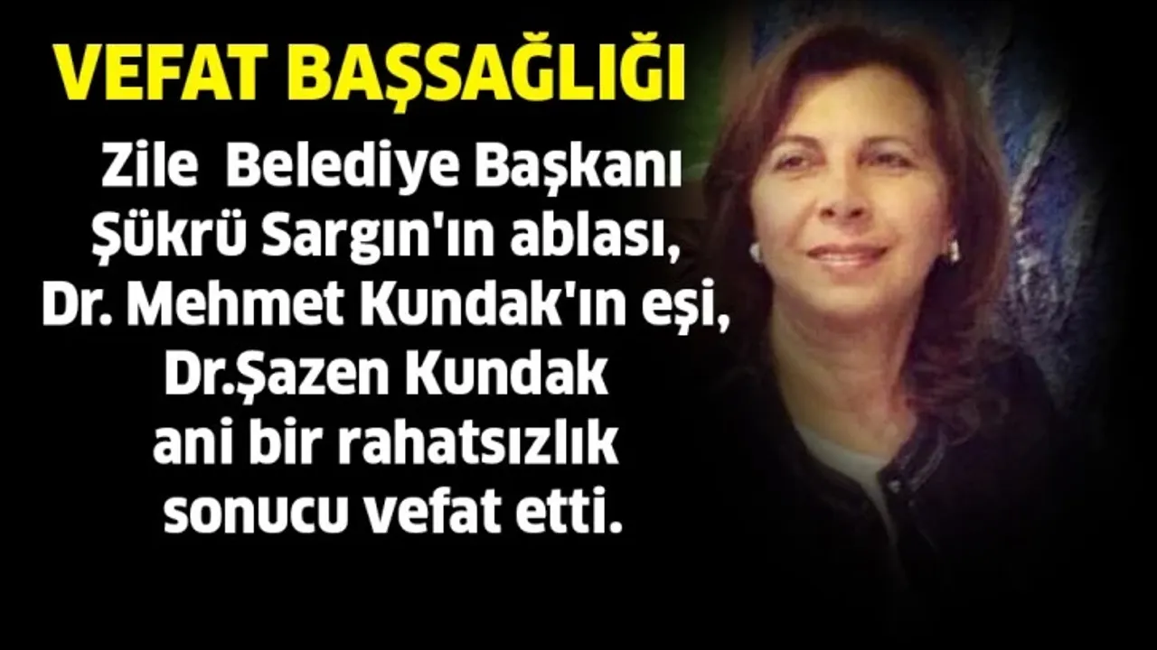 Zile Belediye Başkanı Şükrü Sargın'ın ablası, Dr. Mehmet Kundak'ın eşi, Dr. Şazen Kundak ani bir rahatsızlık sonucu vefat etti. Tokatlılar Başkan Sargın'ın acısını paylaşmak için sosyal medyadan taziyelerini ilettiler.