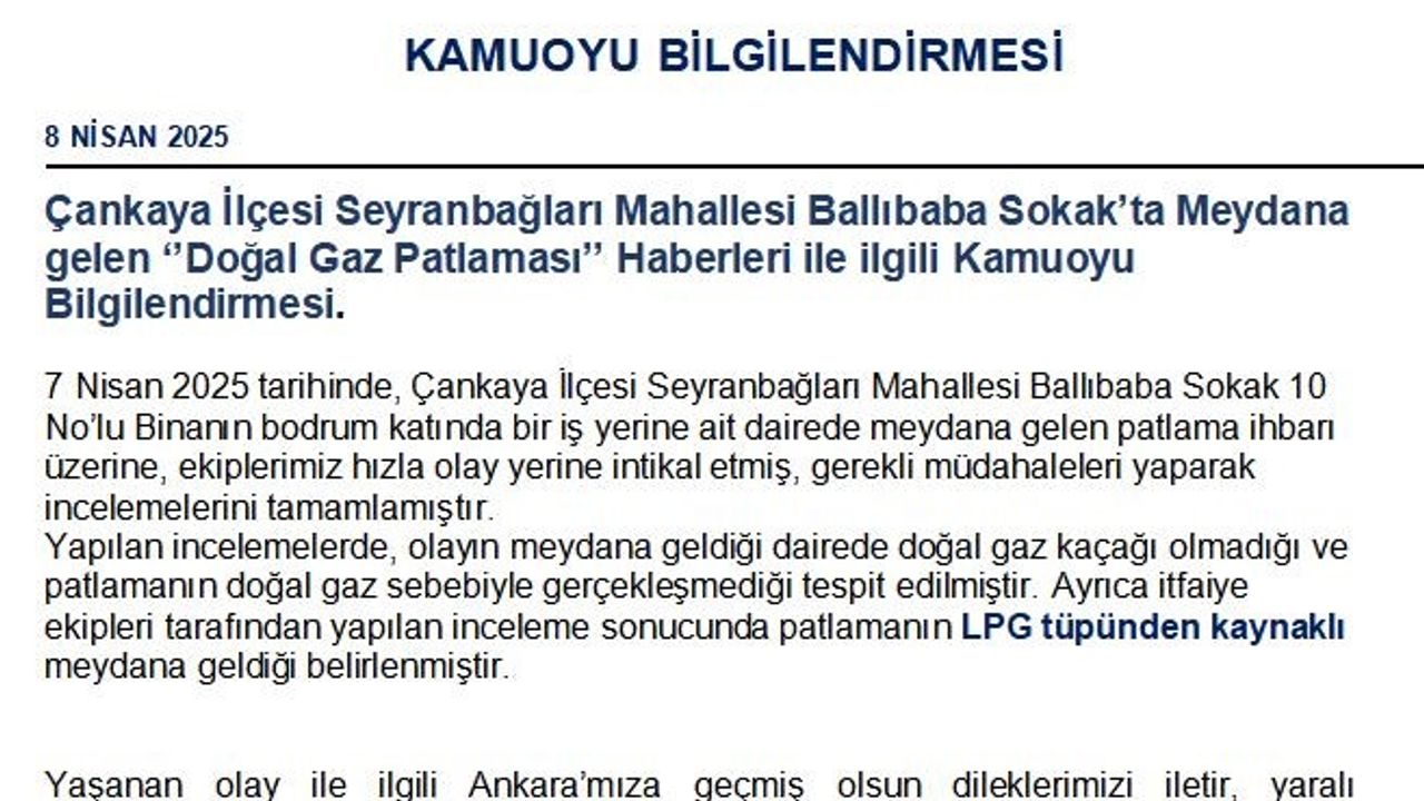 Ankara’nın Çankaya ilçesinin Seyranbağları Mahallesi’nde, bir binanın bodrum katındaki iş yerinde patlama meydana gelmişti. Başkent Gaz’ın yaptığı açıklamaya göre, gerekli müdahaleler sonrası yapılan incelemelerde, olayın meydana geldiği dairede doğal gaz kaçağı olmadığı ve patlamanın doğal gaz sebebiyle gerçekleşmediği tespit edildi. Ayrıca itfaiye ekipleri tarafından yapılan inceleme sonucunda patlamanın LPG tüpünden kaynaklı meydana geldiği belirlendi.