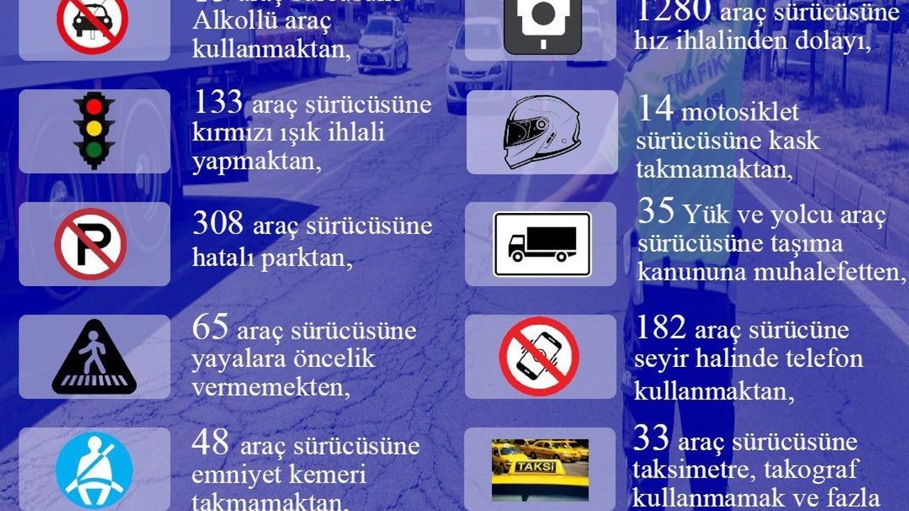 Valilik, İl Emniyet Müdürlüğü Trafik Denetleme Şube ekiplerinin, 1-30 Eylül tarihleri arasında trafik denetimleri gerçekleştirdiğini açıkladı. Yapılan bu denetimlerde 15 araç sürücüsüne alkollü araç kullanmaktan, 133 araç sürücüsüne kırmızı ışık ihlali yapmaktan, 308 araç sürücüsüne hatalı parktan, 65 araç sürücüsüne yayalara öncelik vermemekten, 48 araç sürücüsüne emniyet kemeri takmamaktan, bin 280 araç sürücüsüne hız ihlalinden, 14 motosiklet sürücüsüne kask takmamaktan, 35 yük araç sürücüsüne taşıma kanununa muhalefetten, 182 araç sürücüsüne seyir halinde telefon kullanmaktan, 33 araç sürücüsüne taksimetre, takograf kullanmamak ve fazla yolcu almaktan dolayı toplamda 2 bin 607 sürücüye cezai işlem uygulandığı açıklandı.