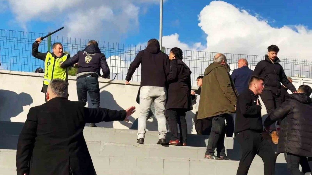 Müsabakanın bitişine saniyeler kala iki takım taraftarları arasında yaşanan küfürlü atışma nedeniyle ortalık karıştı. Birbirlerine su şişeleri fırlatan tarafları polis ekipleri sakinleştirmeye çalıştı. Uyarılar dikkate alınmayınca polis taşkınlığı önlemek için olaya karışanlara copla müdahale etti. Bir polis az kalsın taşkınlığı önlemeye çalışan başka bir polisi copluyordu. O anlar da cep telefonu kamerasıyla kaydedildi.