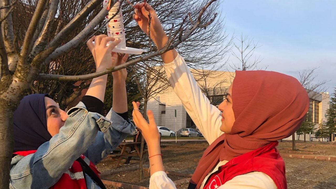 "Sıfır atık" prensibiyle doğadaki plastikleri toplayan öğrenciler, bunları mama kabı ve kuş yemliğine dönüştürdü.