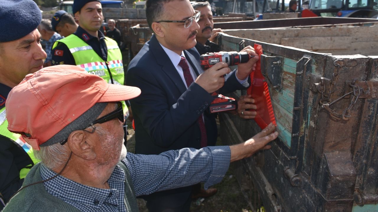 Kaymakam Yılmaz, daha sonra bazı çiftçilerin traktörlerinin römorkuna reflektör takarak, kazasız ve bereketli bir hasat sezonu diledi.