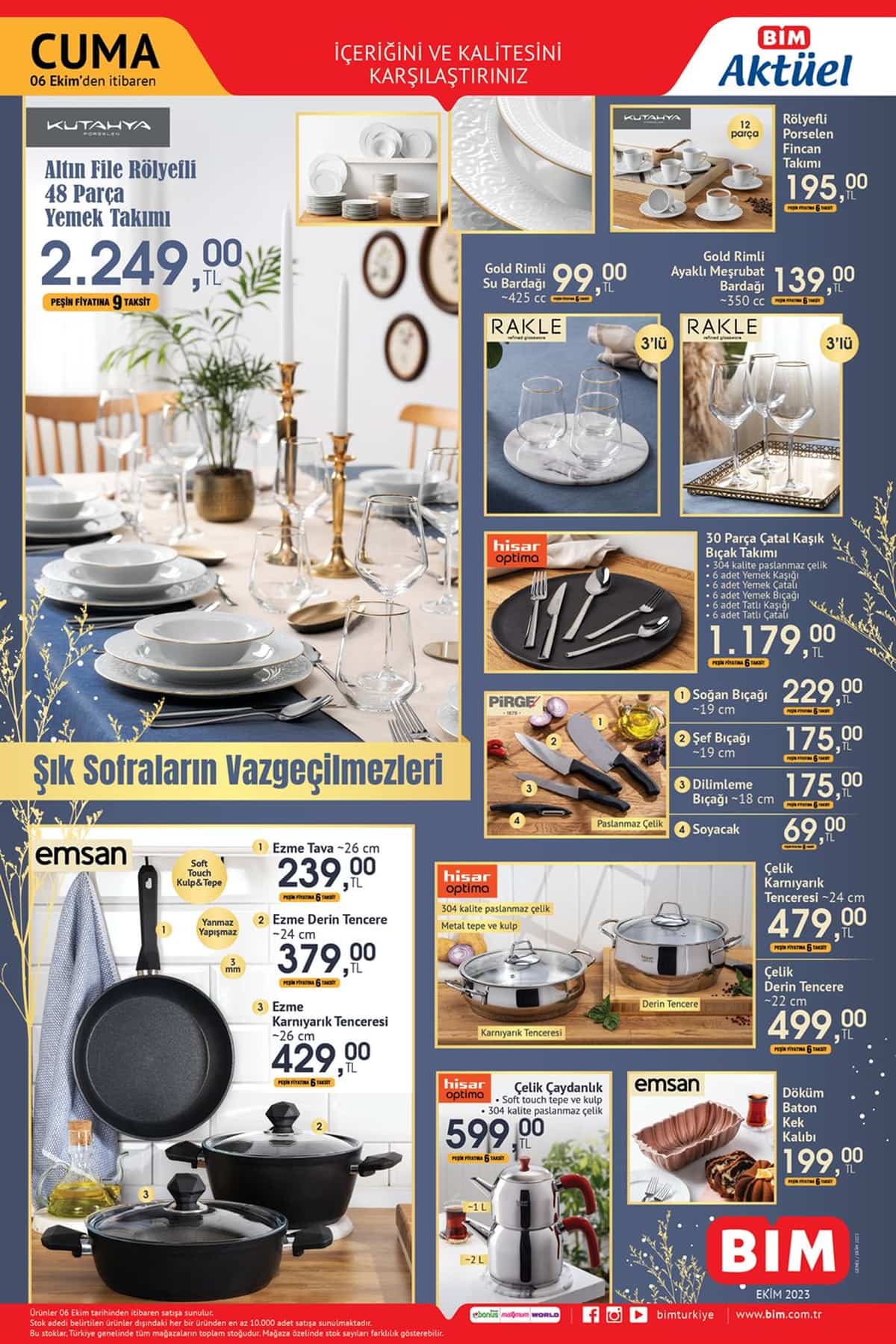 BİM'de Ekim ayının ikinci kampanyası kapsamında hazırlanan aktüel kataloğunun fırsat ürünleri belli oldu. BİM'e bu cuma; HP7N4W2AA Notebook, Arnica Blender Seti, Kütahya Porselen Altın File Rölfeyli 49 Parça Yemek Takımı VE LG 50' UHD Smart Televizyon dikkat çeken ürünler oluyor. Cuma günü için hazırlanan BİM aktüel kataloğunda bu hafta; Fırın, Ocak ve Davlumbazdan oluşan Kumtel Beyaz Cam Ankastre Set 5999 TL fiyatıyla öne çıkıyor.