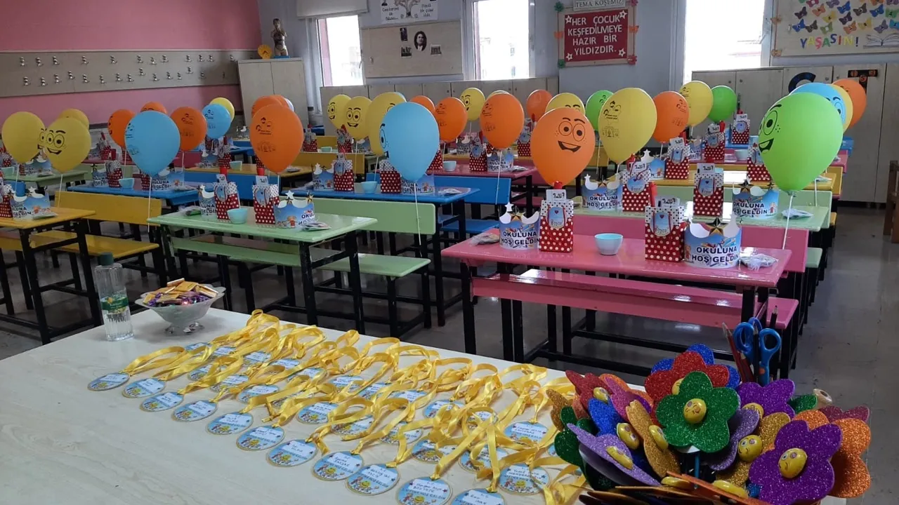 Okullar minikleri sıcak bir karşılama ile ağırlamak için hazırlıkları tamamlandı. Balonlar, süsler ve renkli dekorasyonlarla süslenen sınıfla öğrencilere karşılandı. Okulla ilk kez tanışan öğrenciler sıcak bir atmosferde eğitim hayatlarına başladı.