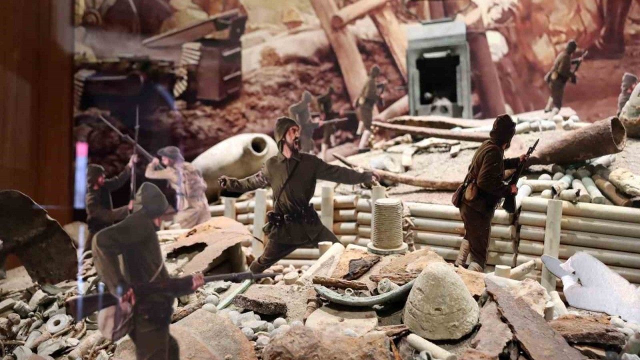Çanakkale’de toprak altından çıkarılan savaş malzemelerinin sergilendiği Çanakkale’den Cumhuriyet’e 100. Yıl Müzesi’ne gelen vatandaşlar, savaş yıllarını yaşıyor.