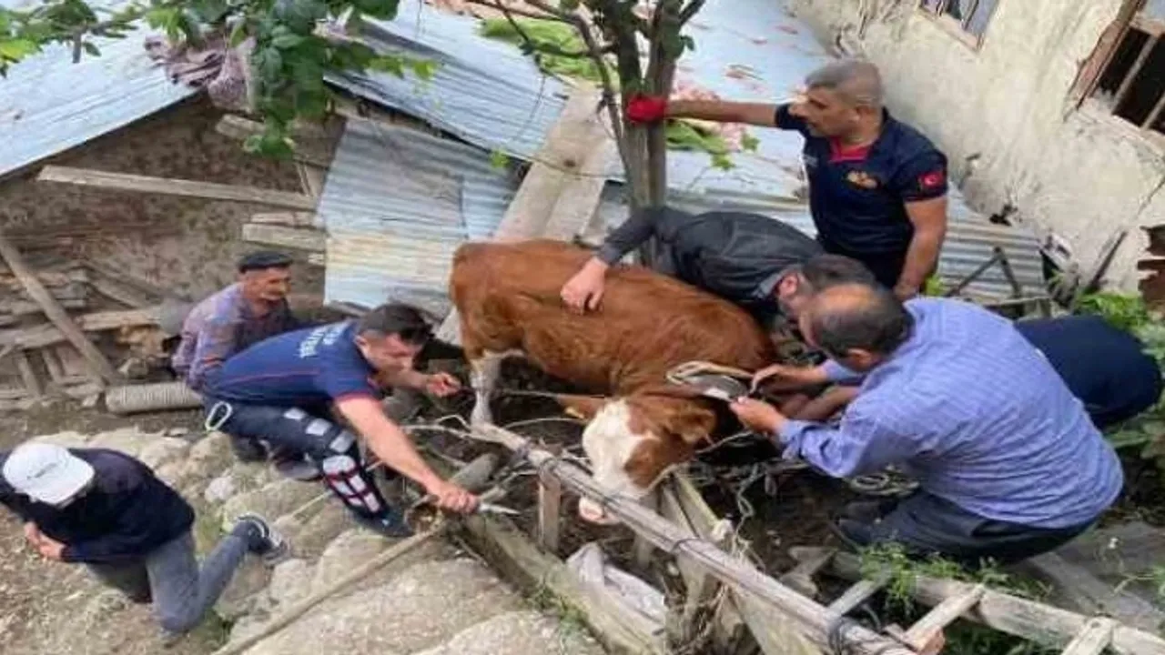 Çorum'un İskilip ilçesinde çatıya çıkan ineği itfaiye ekipleri kurtardı.