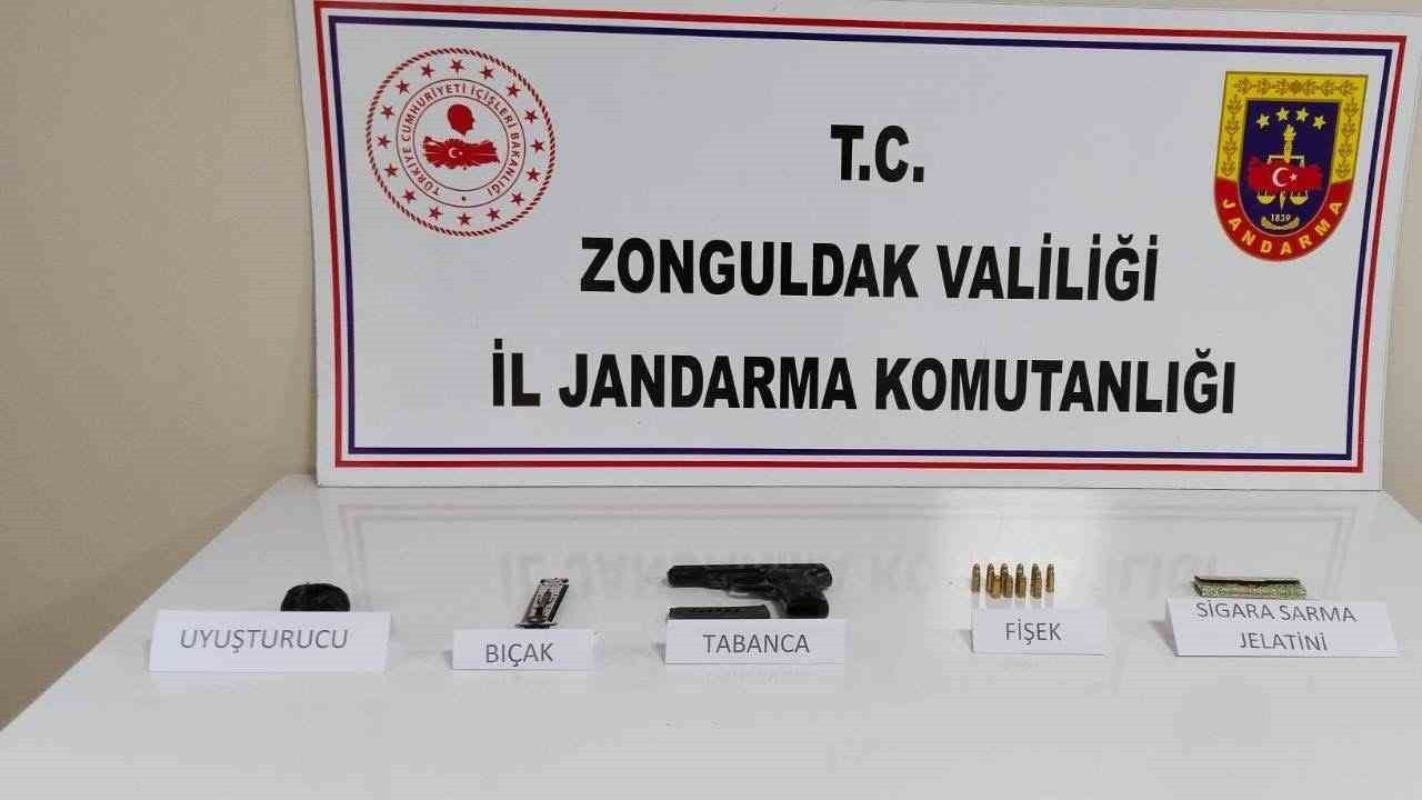 Çaycuma ilçesinde, jandarma ekiplerince gerçekleştirilen denetim sırasında E.O. (28), M.H. (23) ve B.A. (20) isimli şahısların bulunduğu araçta yapılan aramada; 5 gram kubar esrar, 1 adet 7.65 mm ruhsatsız tabanca,
