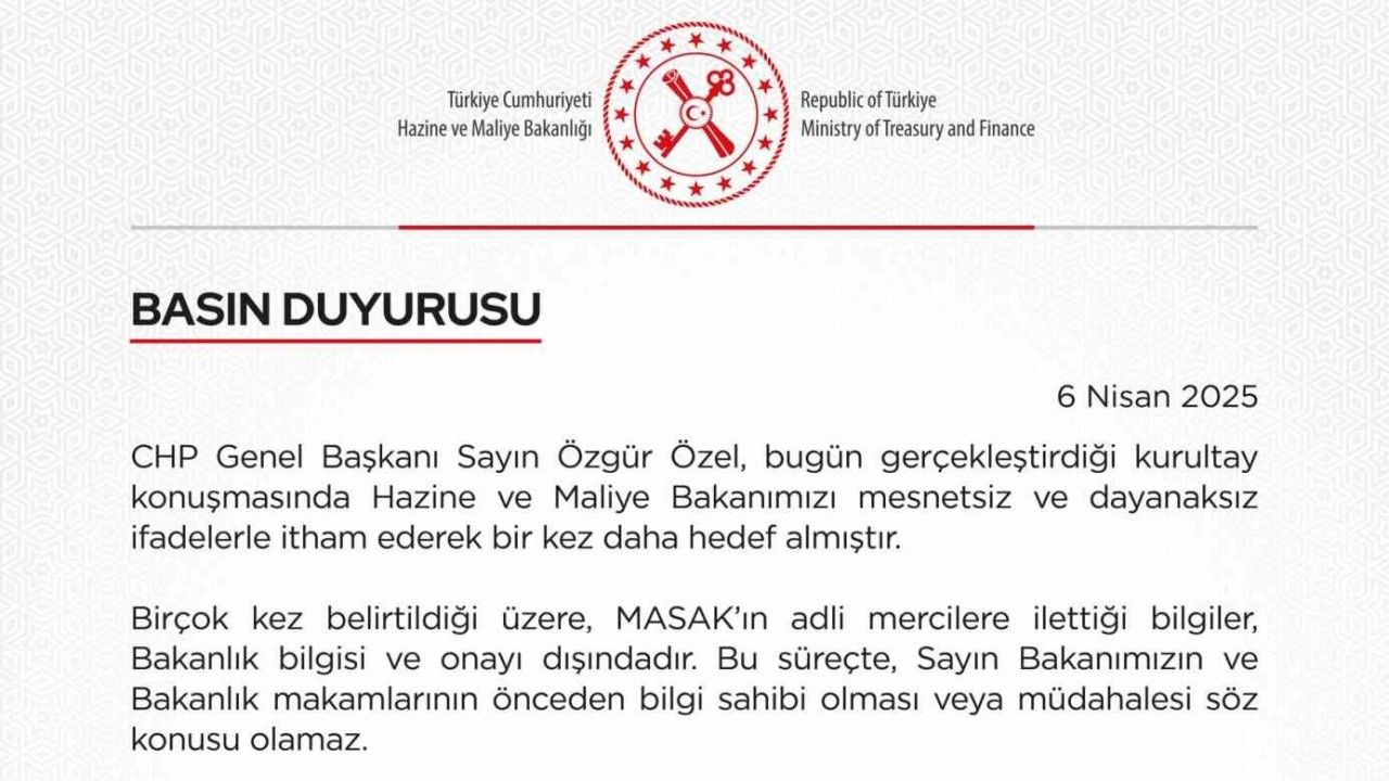 CHP Genel Başkanı Özgür Özel’in, gerçekleştirdiği kurultay konuşmasında Hazine ve Maliye Bakanı Şimşek’i mesnetsiz ve dayanaksız ifadelerle itham ederek bir kez daha hedef aldığı belirtilen açıklamada, "Birçok kez belirtildiği üzere, MASAK’ın adli mercilere ilettiği bilgiler, Bakanlık bilgisi ve onayı dışındadır. Bu süreçte, Sayın Bakanımızın ve Bakanlık makamlarının önceden bilgi sahibi olması veya müdahalesi söz konusu olamaz. Sayın Bakanımıza yönelik ısrarlı ve gerçek dışı ithamları şiddetle reddediyor ve kınıyoruz. Bu çerçevede, Sayın Bakanımıza yönelik itibar suikastı amaçlı iftira ve asılsız ithamlar hakkında hukuki yollara başvurulacaktır. Kamuoyuna saygıyla duyurulur" ifadelerine yer verildi.