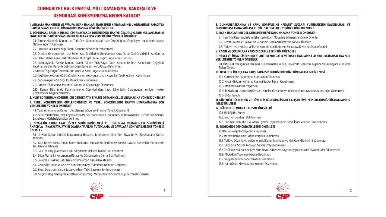 CHP’nin komisyona sunduğu ve kamuoyuyla paylaştığı öneri paketi, 13 ana başlık altında detaylandırıldı.