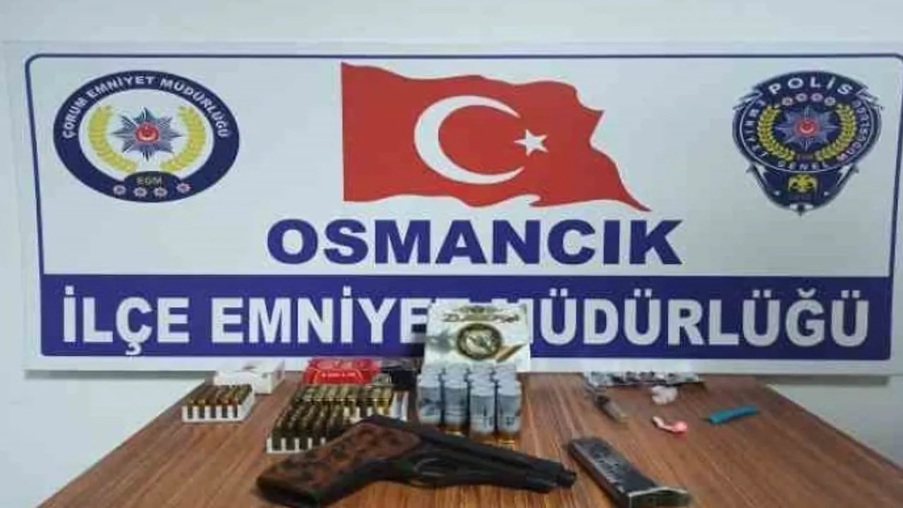 Osmancık İlçe Emniyet Müdürlü ekipleri alınan ihbar ve yapılan araştırmalar neticesinde ilçe merkezindeki bir adrese operasyon düzenledi. Operasyonda yapılan aramalarda 1 adet tabanca, 1 adet şarjör, 97 adet MKE menşeili fişek, 18 adet av tüfeği fişeği, 1.45 gram metamfetamin maddesi, 1 adet cam pipet, 4 adet Galara sentetik ecza ile 4 adet Extacsy sentetik ecza maddesi ele geçirildi. Operasyon düzenlenen adreste bulunan 2 şüpheli de gözaltına alındı.
