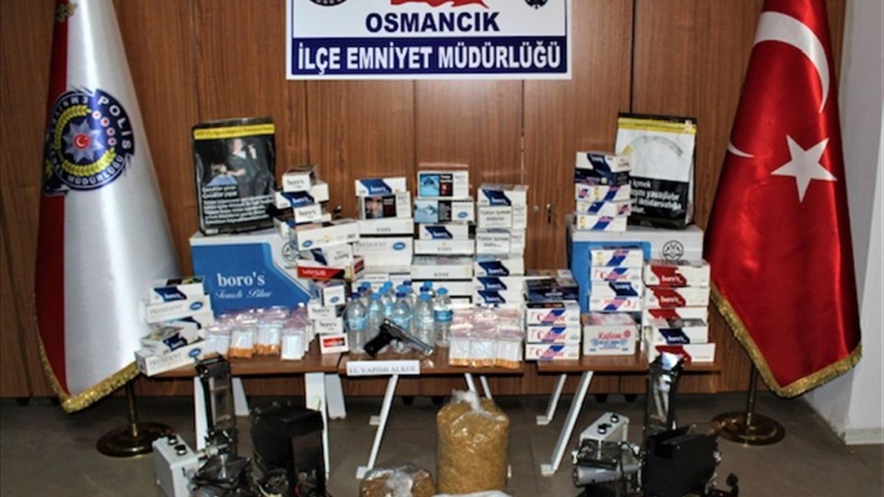 4 iş yeri, 1 ikamet ve 3 araçta yapılan aramada 2 elektrikli otomatik sigara sarma makinesi, ruhsatsız tabanca, 19 bin 300 doldurulmuş makaron, 7 kilo 200 gram kıyılmış tütün ile 7,5 litre sahte içki ele geçirildi.