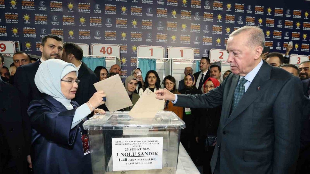 Ankara Spor Salonu’nda düzenlenen kongrede Genel Başkanlığa tekrar aday gösterilen Erdoğan, eşi Emine Erdoğan ile geldiği salonda, oyunu 1 No’lu sandıkta kullandı.