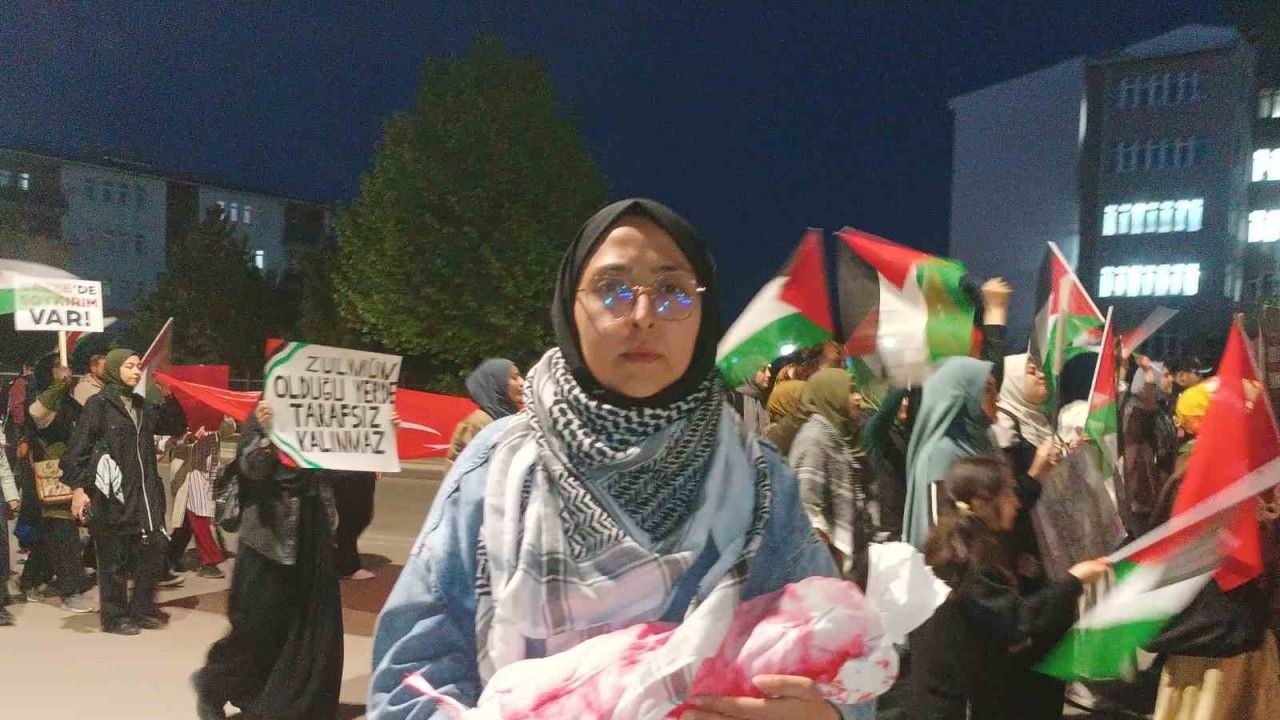 Faldum Köprüsü yan tarafında başlayan protesto yürüyüşü, Taha Akgül Spor Salonu önüne kadar devam etti. Katılımcılar, ellerindeki pankartlar ve bayraklarla birlikte meşale yakıp sloganlar atarak İsrail’i protesto etti. Öğrencilerin hazırlamış oldukları kanlı bebek maketleriyle yürümeleri dikkat çekti. Tekbirler eşliğinde devam eden program yürüyüşün tamamlanmasıyla sona erdi.