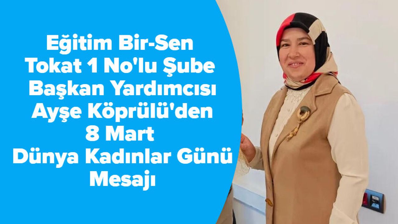 Eğitim Bir-Sen Tokat 1 No'lu Şube Başkan Yardımcısı Ayşe Köprülü, 8 Mart Dünya Kadınlar Günü dolayısıyla bir mesaj yayımladı. Köprülü, Birleşmiş Milletler tarafından "Dünya Kadınlar Günü" olarak kabul edilen 8 Mart'ın, kadınların çalışma koşullarını iyileştirmek, sosyal, ekonomik ve kültürel haklarını geliştirmek, sorunlarını tartışmak ve farkındalık yaratmak amacıyla kutlandığını belirtti. Ancak, bu günün bazı karanlık odaklar tarafından asıl amacından saptırıldığını ifade ederek, bu durumun üzücü olduğunu vurguladı.