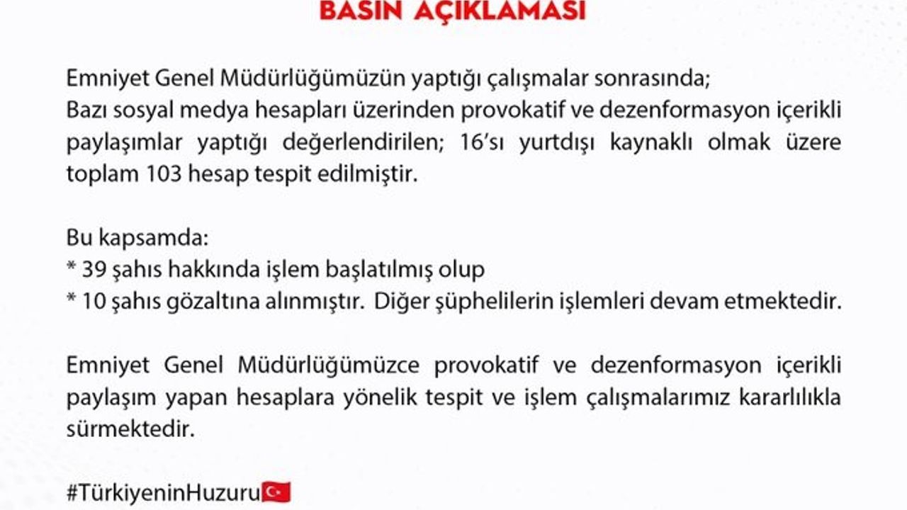 "Emniyet Genel Müdürlüğümüzün yaptığı çalışmalar sonrasında; bazı sosyal medya hesapları üzerinden provokatif ve dezenformasyon içerikli paylaşımlar yaptığı değerlendirilen; 16’sı yurtdışı kaynaklı olmak üzere toplam 103 hesap tespit edilmiştir. Bu kapsamda, 39 şahıs hakkında işlem başlatılmış olup, 10 şahıs gözaltına alınmıştır. Diğer şüphelilerin işlemleri devam etmektedir. Emniyet Genel Müdürlüğümüzce provokatif ve dezenformasyon içerikli paylaşım yapan hesaplara yönelik tespit ve işlem çalışmalarımız kararlılıkla sürmektedir."