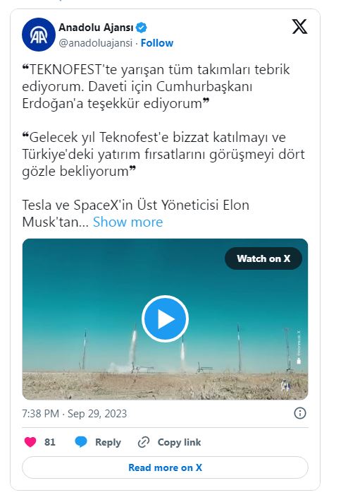 Musk, X sosyal medya hesabında, Türkiye'nin en büyük havacılık, uzay ve teknoloji festivali TEKNOFEST'e ilişkin paylaşımda bulundu.