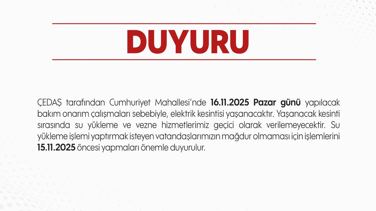 Belediyeden yapılan açıklamada, elektrik kesintisi nedeniyle su yükleme noktalarının ve vezne hizmetlerinin geçici süreyle hizmet veremeyeceği belirtildi. Vatandaşların mağduriyet yaşamaması için gerekli hazırlıkları yapması istendi.