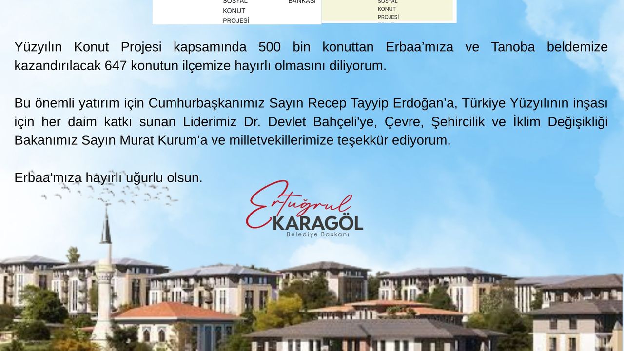 "Erbaa'mıza hayırlı uğurlu olsun" temennisiyle mesajını noktalayan Belediye Başkanı Karagöl'ün bu açıklaması, ilçe sakinleri tarafından büyük memnuniyetle karşılandı. "Yüzyılın Konut Projesi" kapsamında Erbaa'ya kazandırılacak olan 647 konutun, ilçenin konut ihtiyacının karşılanmasına ve şehirleşmesine önemli bir katkı sağlaması bekleniyor.