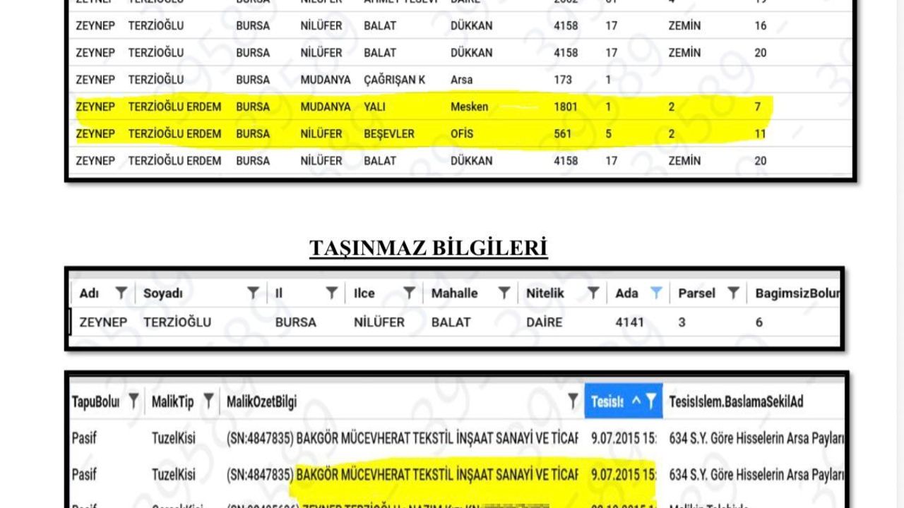 Eski Nilüfer Belediye Başkanı Turgay Erdem'in rüşvetten aldığı ev ve dükkanı sevgilisinin üzerine yaptığı ortaya çıktı. İlk eşi Serpil Erdem'den 2021 yılında boşanan Turgay Erdem, eşinden boşandıktan bir hafta sonra Zeynep Terzioğlu ile ikinci kez dünya evine girmişti. Bursa'da yürütülen 'rüşvet ve yolsuzluk' soruşturması kapsamında ifade veren Emin Adanur, Turgay Erdem ile Zeynep Terzioğlu'nun evlenmeden önce uzunca bir süre sevgili olduğunu iddia etti. Bu dönemde Erdem'in Bakgör Yapı isimli firmasının Balat Mahallesi'nde yapılan bir projesi için usulsüz emsal artışı yaptırdığı belirlendi. Adanur, firmanın bu artış karşısında Belediye Başkanı Erdem'e bir adet daire ve bir dükkanı rüşvet olarak verdiğini ileri sürdü. Adanur, Erdem'in rüşvet olarak aldığı ev ve dükkanı o dönem sevgilisi olan Zeynep Terzioğlu'nun üzerine yaptığını öne sürdü. Adanur, bu durumu daha sonra tapudan öğrendiğini söyledi. O dönem Nilüfer Belediyesi'ne ait bir kütüphanede memur olarak çalışan Terzioğlu ile iletişime geçtiğini ifade eden Adanur, 'Sen memursun. Ekonomik olarak her şeyin belli. Bir memur olarak Balat Mahallesi'nde bir dükkân ve bir daireyi üzerine alman manyaklık' dediğini belirtti. Adanur'un bu sözleri üzerine panikleyen Terzioğlu'nun, 'Araştırırlarsa çıkar mı?' diye sorduğunu aktardı. Adanur, bunun tapu kayıtlarından çıkacağımı söylemesi üzerine Terzioğlu'nun söz konusu iki tapuyu başka şahısların üzerine devrettiğini söyledi.