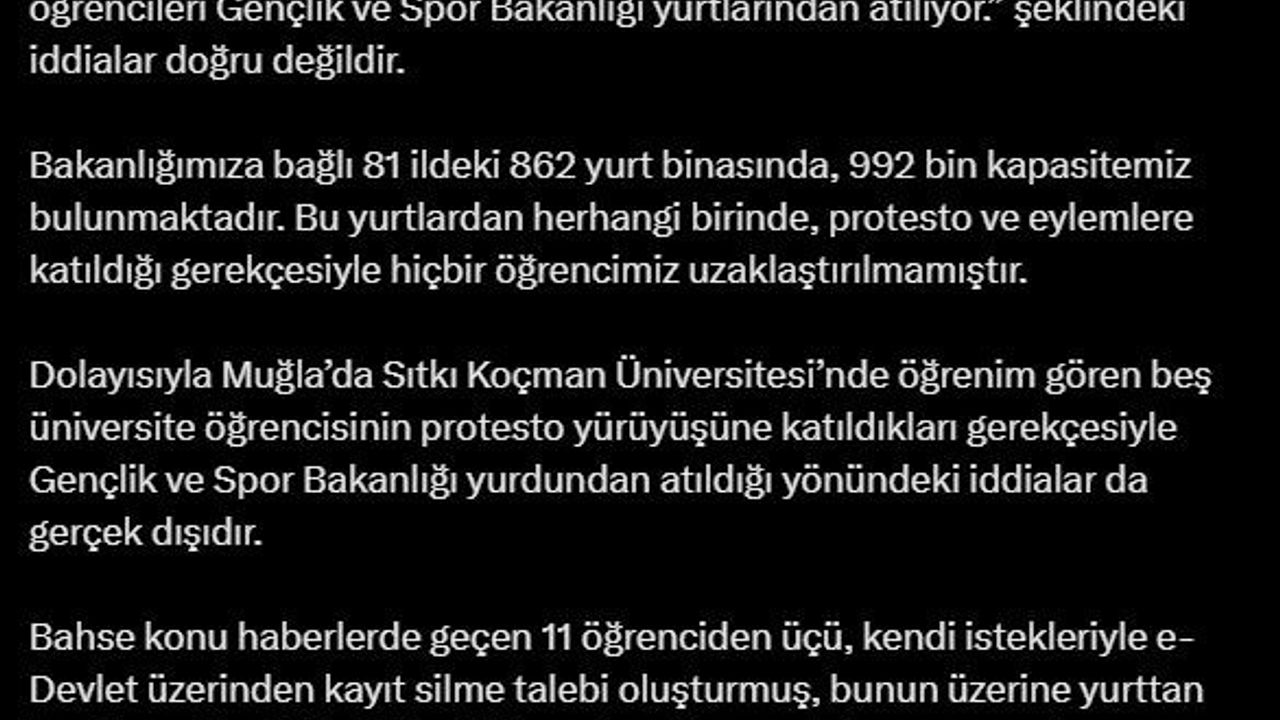 KYK’nın sosyal medya hesabından yapılan açıklamada, bazı basın yayın organlarında yer alan ve sosyal medya hesaplarında paylaşılan ‘Protesto ve eylemlere katılan üniversite öğrencileri Gençlik ve Spor Bakanlığı yurtlarından atılıyor’ iddialarının doğru olmadığı belirtildi. Gençlik ve Spor Bakanlığı’na bağlı 81 ildeki 862 yurt binasında 992 bin kişilik kapasitenin bulunduğu ifade edilen açıklamada, "Bu yurtlardan herhangi birinde protesto ve eylemlere katıldığı gerekçesiyle hiçbir öğrencimiz uzaklaştırılmamıştır. Dolayısıyla Muğla’da Sıtkı Koçman Üniversitesi’nde öğrenim gören 5 üniversite öğrencisinin protesto yürüyüşüne katıldıkları gerekçesiyle Gençlik ve Spor Bakanlığı yurdundan atıldığı yönündeki iddialar da gerçek dışıdır. Bahse konu haberlerde geçen 11 öğrenciden 3’ü, kendi istekleriyle e-Devlet üzerinden kayıt silme talebi oluşturmuş, bunun üzerine yurttan kayıtları silinmiştir. Diğer 8 öğrenci yurtlarımızda barınmaya devam etmektedir. Algı oluşturmak maksadıyla ortaya atılan asılsız iddialara itibar edilmemelidir" ifadelerine yer verildi.