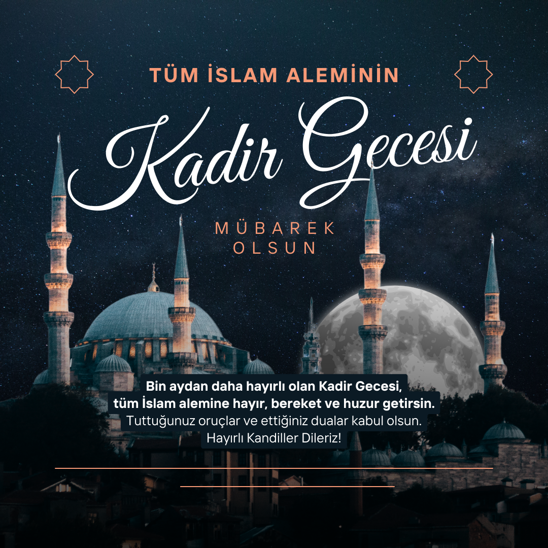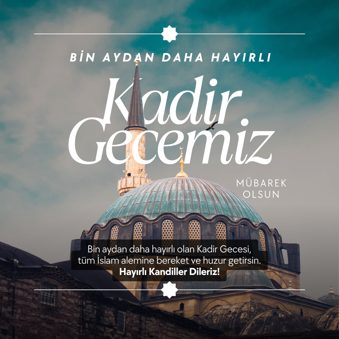 Kadir Geceniz mübarek olsun! Bu feyiz dolu gecede, dualarımız semaya yükselirken yüreklerimizdeki umutlar parıldıyor. Rabbimizin sonsuz rahmetiyle aydınlanan bu gecede, geçmişin hatırlattığı derslerle geleceğe umutla bakıyoruz. Kadir Gecesi, bize yeniden doğma ve arınma şansı sunuyor. Bu gece, duaların en samimi haliyle kabul olduğu bir zaman dilimi. Tüm dualarınızın ve niyetlerinizin gerçekleştiği bir gece geçirmeniz dileğiyle. Hayırlı Kandiller.