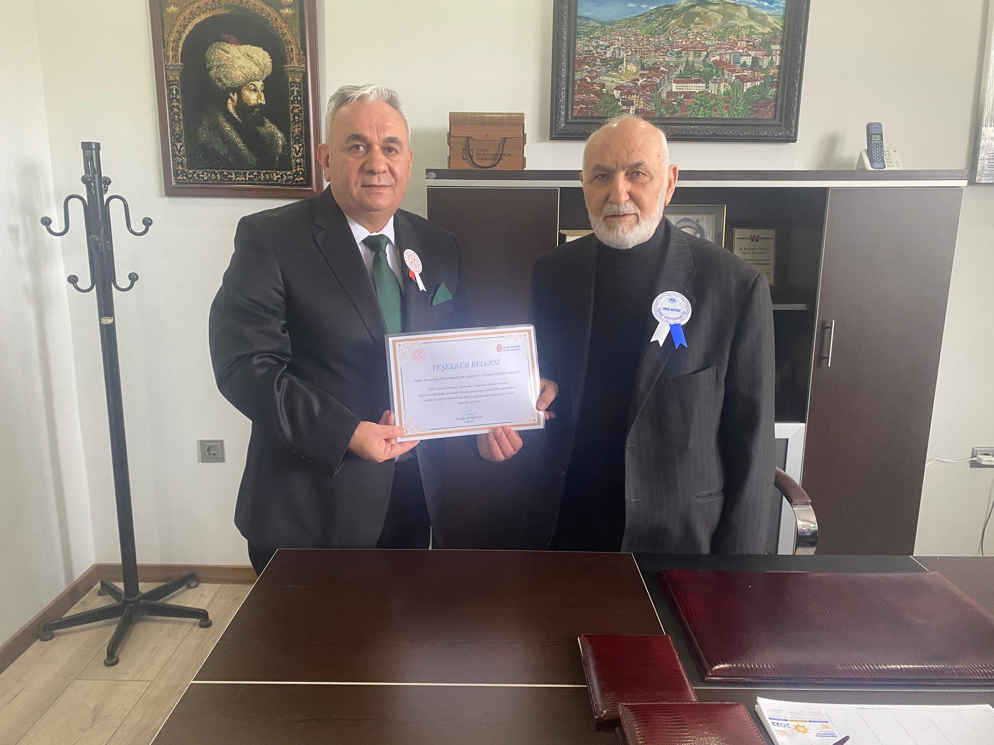 Tokat Defterdarı Aliaddin KARPINAR, Vergi Dairesi Müdür V. Zekayi ÇELİK ve Gelir Müdür V. Mahmut ÖZBEK ile birlikte gerçekleşen ziyarette vergi rekortmeni mükellefler Camcı Aslan BAŞDİNÇ Ticaret adına Aslan BAŞPINAR’a, GİDEN Otomotiv San. Tic. Ltd. Şti. adına Rıza GİDEN’e, TOKİN İnşaat Ltd. Şti. adına Yunis ve İlhan YILMAZ'a, Topçam Küp Şeker Yönetim Kurulu Başkanı Celal YÜKSEL ve Genel Müdürü Umut YÜKSEL’e, Opet Petrol İşletme Sahibi Fatma Necla AĞAOĞLU'na, Kılıçarslan Demir Çelik Yönetim Kurulu Başkanı Mehmet KILIÇARSLAN’a, Çözüm Sigorta Aracılık Hizmetleri İş yeri sahibi Fatih UÇAR'a, Arçelik Bayii Sahibi Serdar UÇAR'a ve Elit Medikal İşletme sahibi Yusuf Caner SOMUNCU'ya, Oruçlar Otomotiv A.Ş. Yönetim Kurulu Başkanı Mazhar ORUÇ ve Murat ORUÇ'a, Cangözler Petrol - Gıda Nakliye İnşaat Petrol Otomotiv Sanayi Tic. Ltd. Şti. Genel Müdürü Fatih CANGÖZ'e, Türkylıldız Petrol Tic. Ltd. Şti işletme sahibi Servet ÖZTÜRK'e, Serhat Gıda San. Tic. Ltd. Şti. işletme sahibi Mustafa ve Mesut ÖZDEMİR'e, Erenler Gıda Tarım, Temizlik Sanayi Tic. Ltd. Şti. Yönetim Kurulu Başkanı Dursun SANSAR'a, Has Özgen Tekstil Pazarlama San. Tic. A.Ş. Yönetim Kurulu Başkanı Fahri ÖZGEN'e, Şahinler Otomotiv İnşaat Tekstil Ltd. Şti. Yetkilisi Murat Şahin’e, Şenyıl Petrol Ürünleri San. Tic. A.Ş. Yetkilisi Emin Yılar’a, İncipark Düğün Salonu İşletmecisi Turgut Yaşar’a, Medikalpark Hastanesi Grup Yönetim Kurulu Başkanı Uzm. Dr. N. Bilal DURMAZ ve Genel Müdürü Uzm. Dr. Dursun BULUT'a, Şifa Eczanesi sahibi Ecz. Muhammet Ali DURMAZ'a, Özgün Sigorta Aracılık Hizmetleri Ltd. Şti sahibi Rıza YILDIZ'a, Kenan Aslan Sigorta Acenteleği sahibi Kanan ASLAN'a, İDS Grup Sigorta Aracılık Hizm. Ltd. Şti sahibi İsmail DEMİRCAN'a teşekkür belgesi verildi.