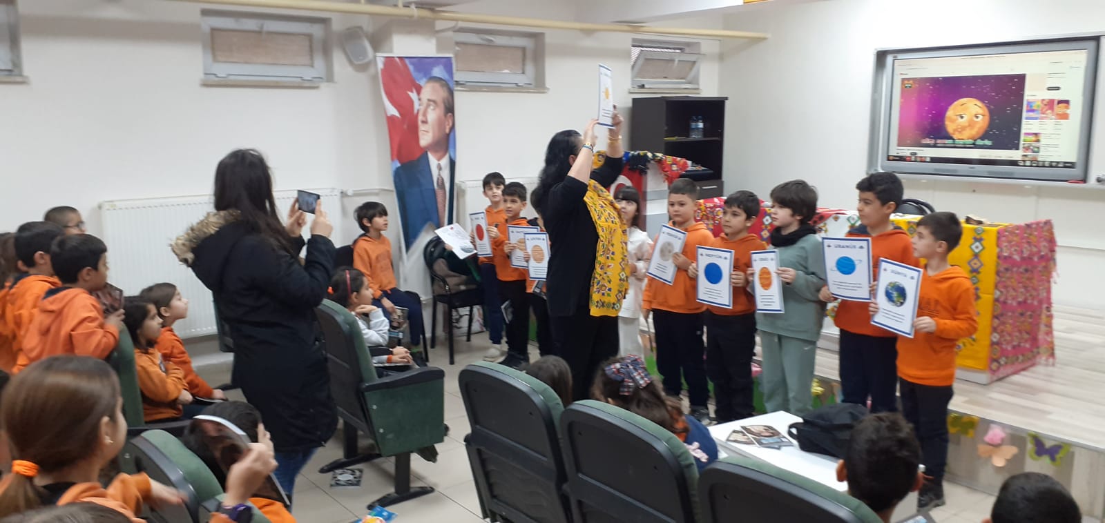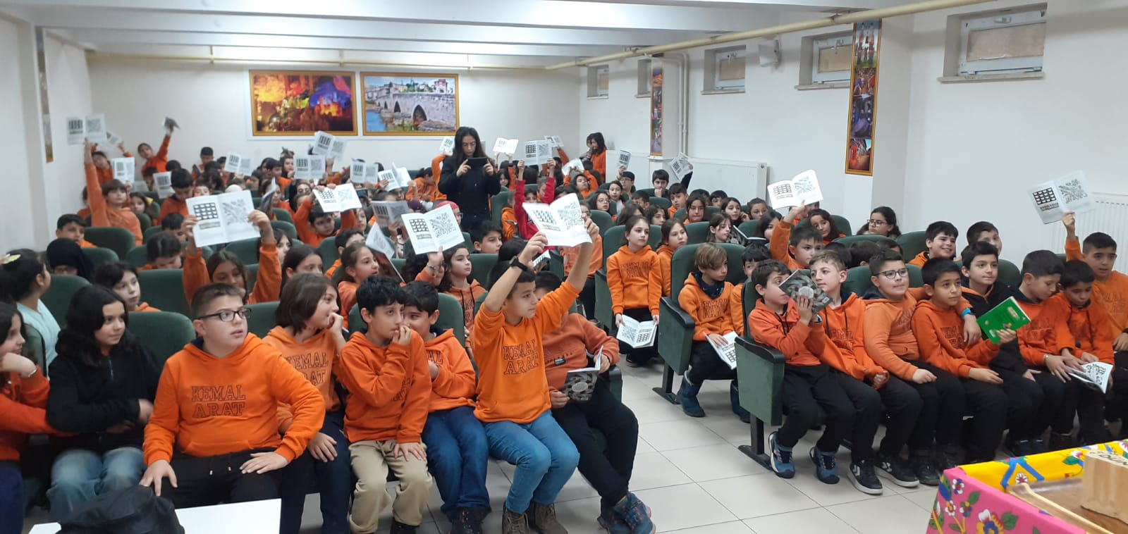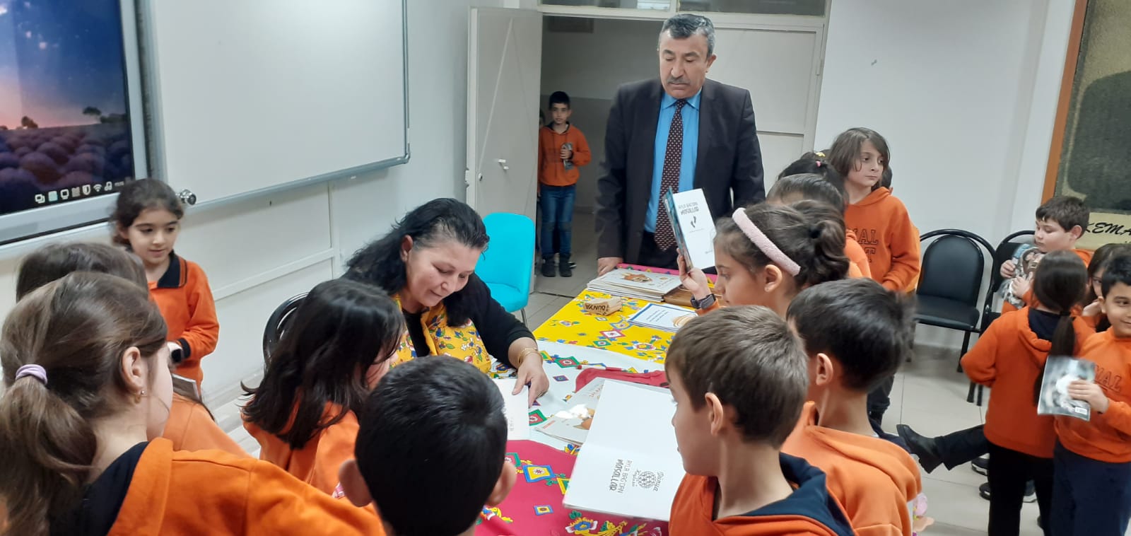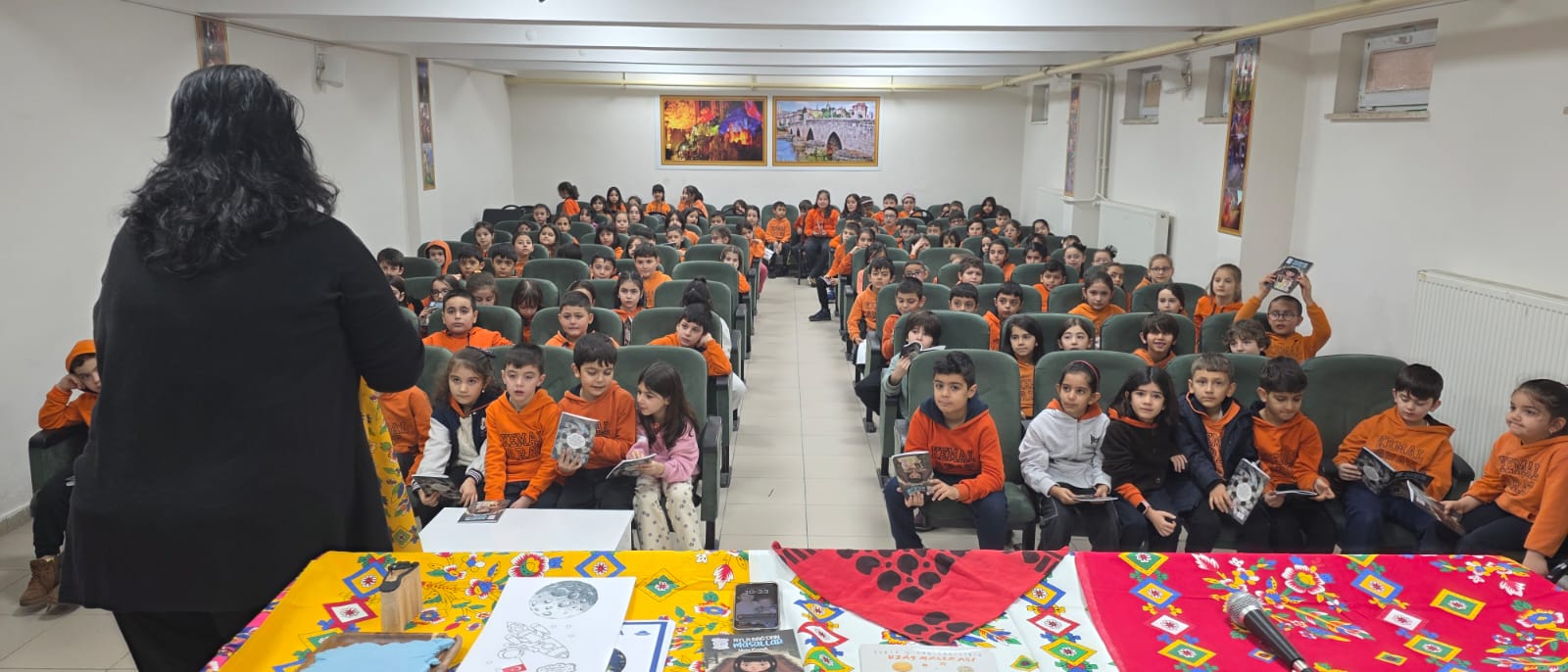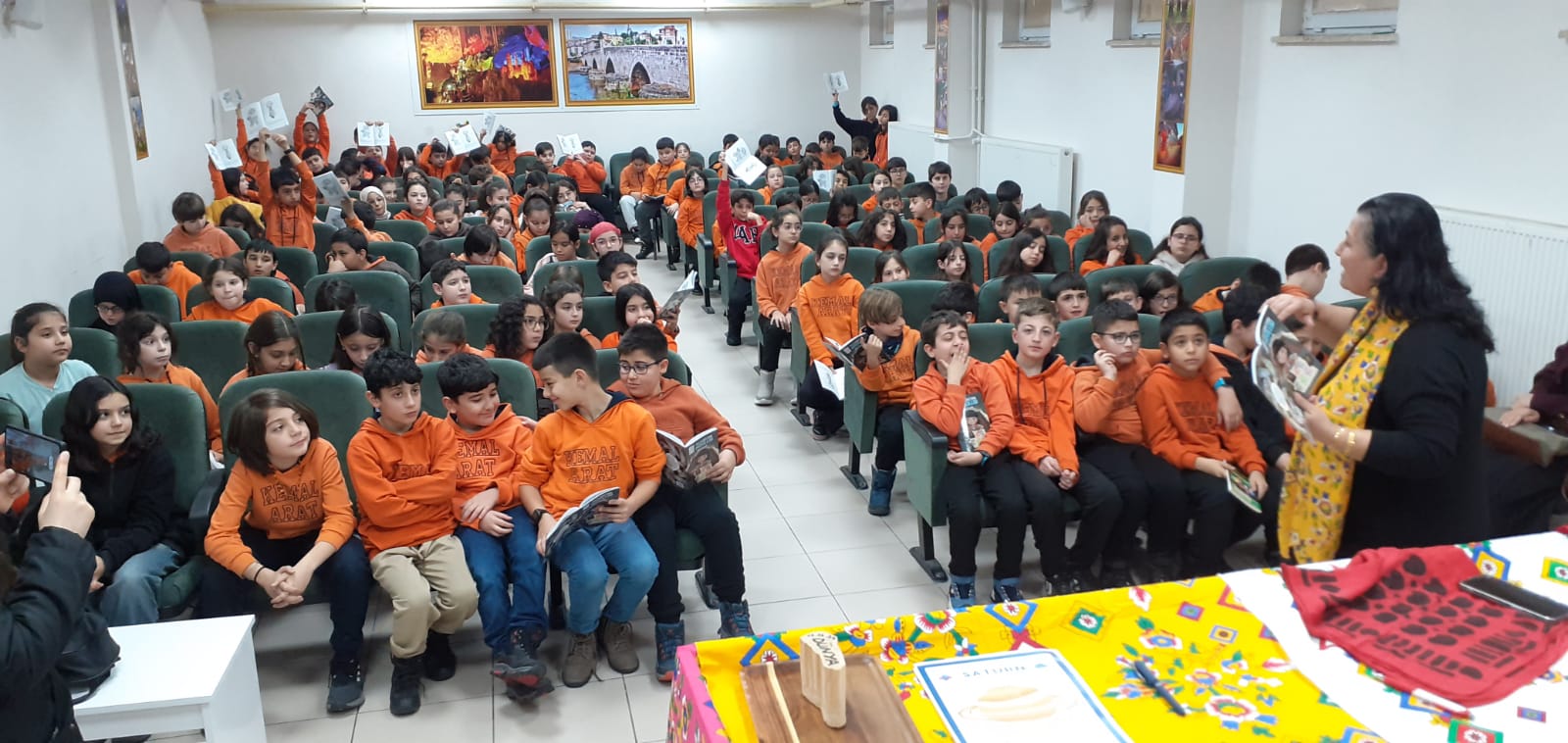 Okul Müdürü Sadettin Aktaş, Müdür Yardımcıları Nusret Camcı ve Cemal Nafiz Güler, sınıf öğretmen ve öğrencileriyle konferans salonunda yazar Ayla Bağ’ı konuk ettiler.