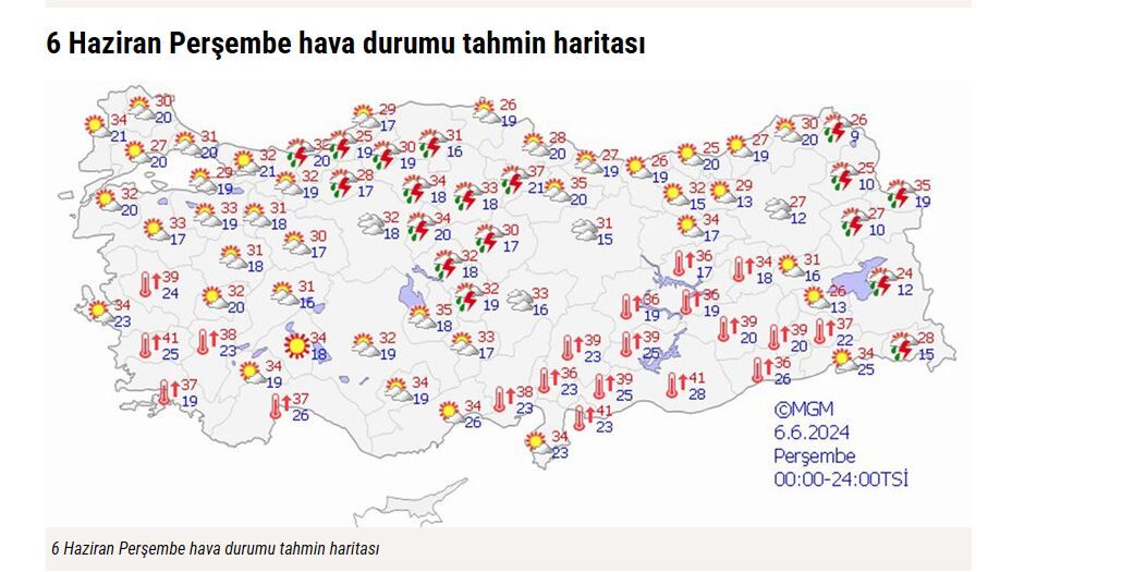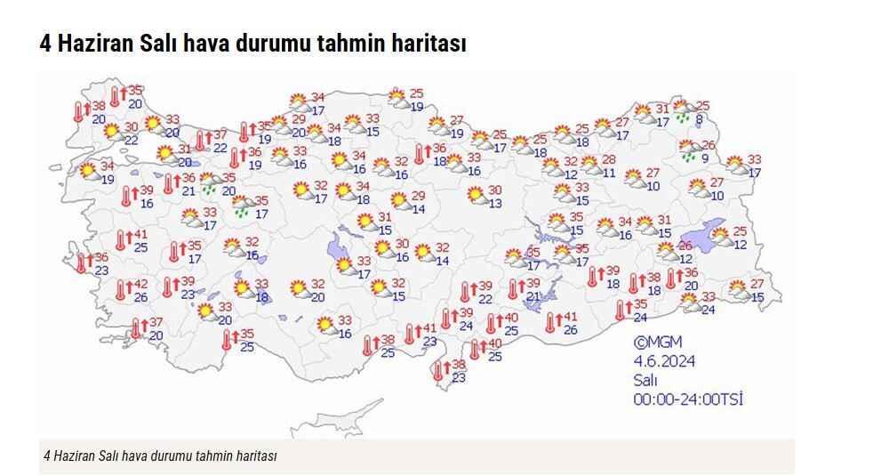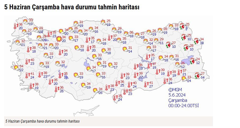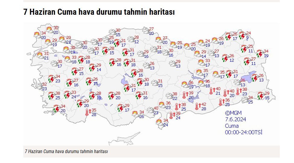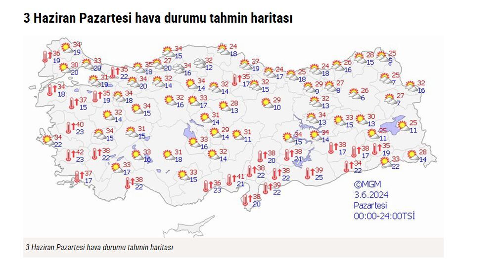 Haritalarla açıklanan hava durumu tahminlerine göre, özellikle Güneydoğu Anadolu ve Akdeniz bölgelerinde hava sıcaklıkları 40 dereceyi aşacak. Ege Bölgesi'nde de sıcaklıkların 35-38 derece arasında seyretmesi bekleniyor. İç Anadolu Bölgesi'nde ise sıcaklıklar 30-35 derece aralığında olacak.